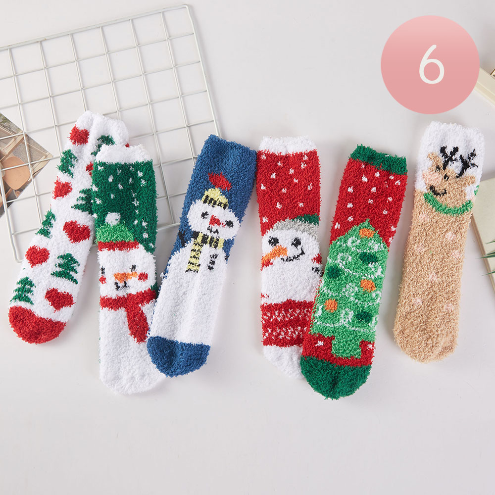 Details • Size : 9 - 11 • Material : 100% Polyester • Cozy fuzzy socks in a 6-pair Christmas-themed set with festive characters like snowmen, trees, and reindeer. Soft and warm for winter lounging or gifting. Stretchy and comfortable for all-day indoor wear. Fun holiday patterns perfect for seasonal spirit.