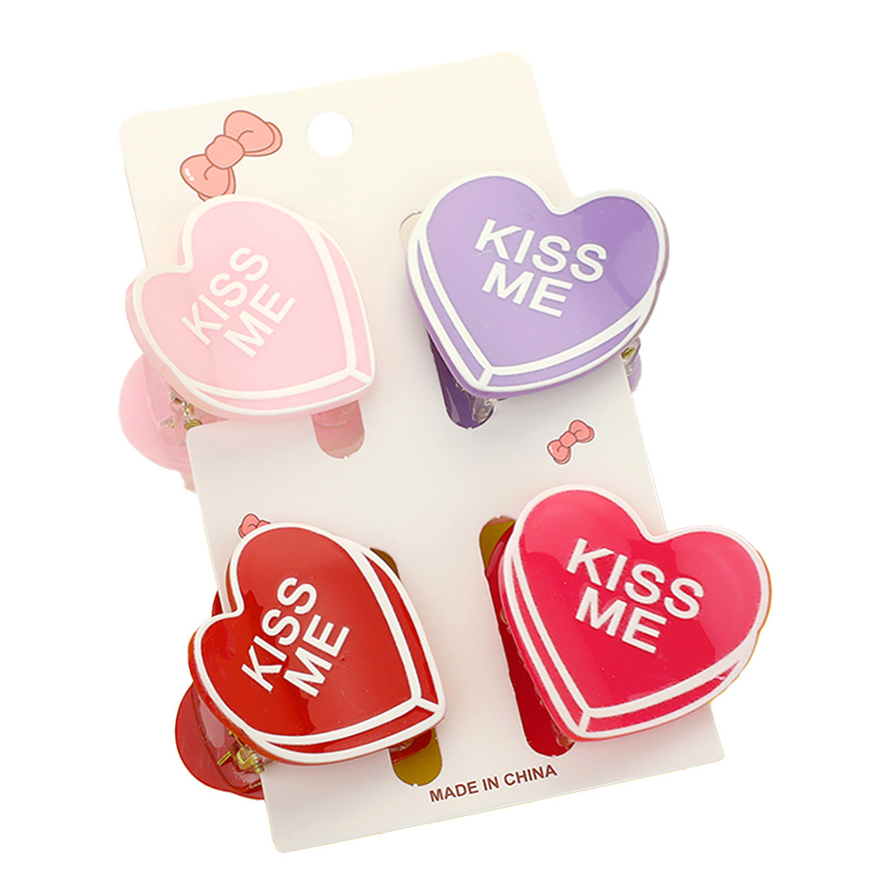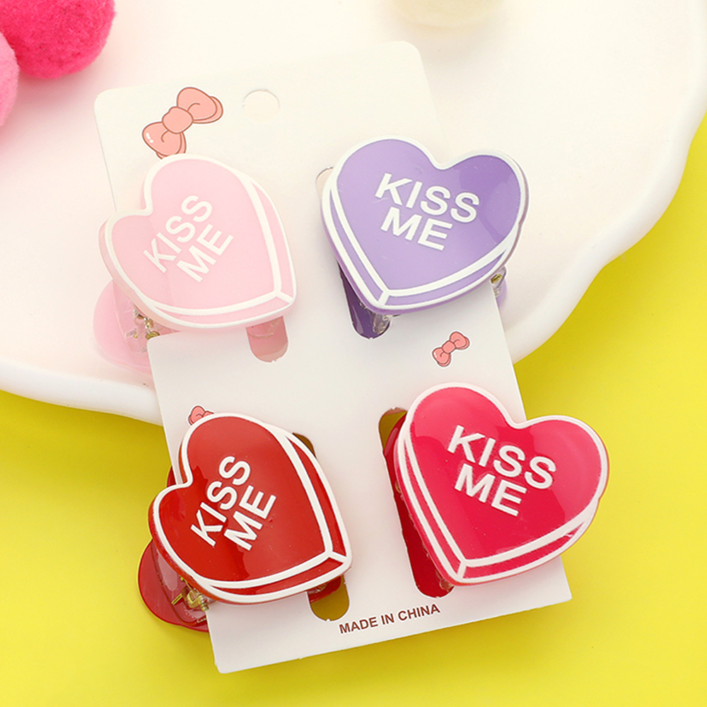 Details • Size : 1.5" X 1.6" • Playful heart-shaped hair claw clips with a bold “KISS ME” message, designed to add a fun, flirty touch to everyday hairstyles. Easy to use and secure, they are ideal for holding bangs or half-up styles and make eye-catching accessories for gifting, seasonal collections, and trend-forward displays.