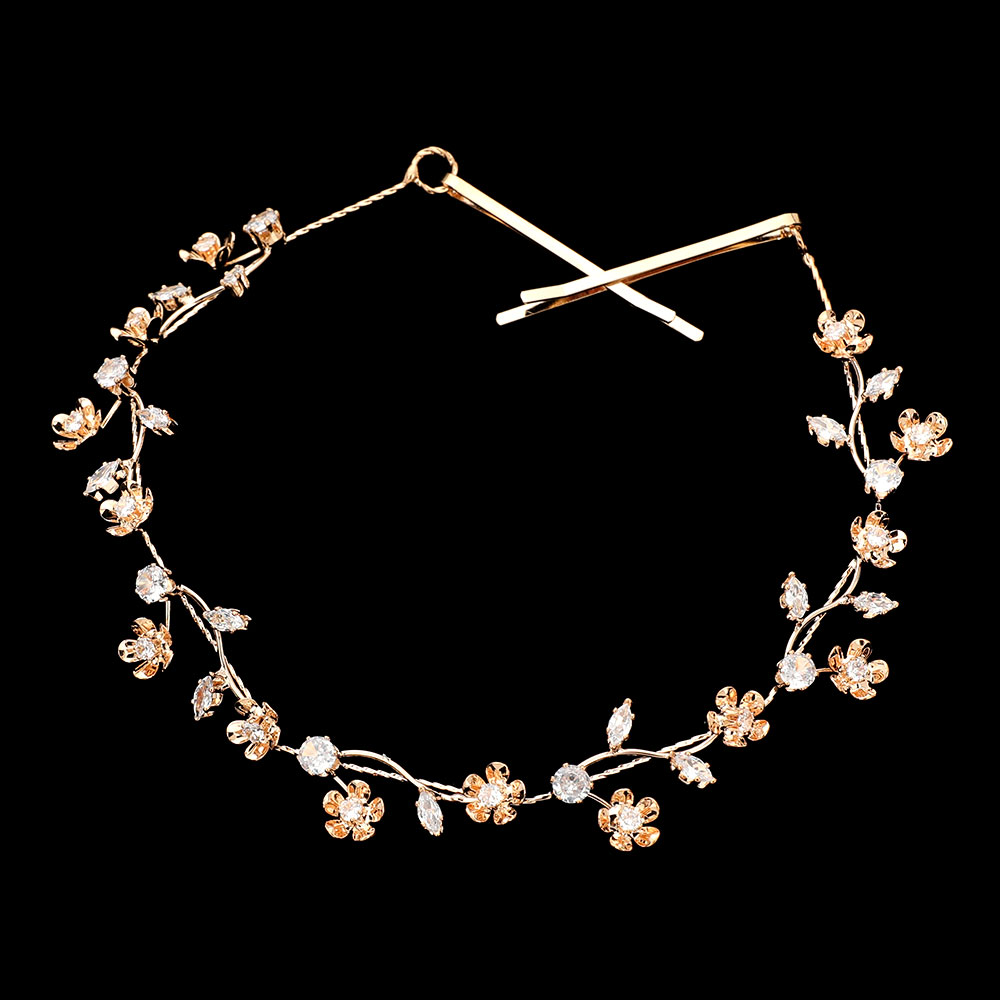 Details • Size : 11" X 0.8" • A Pair Bobbi Pin Included • This bridal hair vine showcases petite blossoms and sparkling cz crystal details arranged along a flowing, organic design. Flexible for shaping around updos or half-up styles, it brings a soft, romantic elegance ideal for weddings and formal occasions. • CZ Cubic Zirconia • Lead and Nickel Compliant