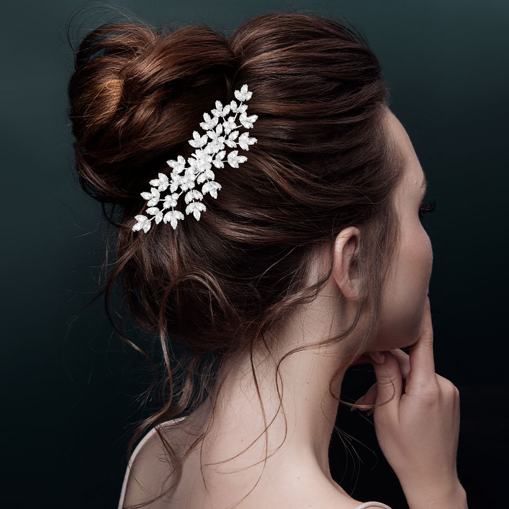 Details • Size : 4.5" X 1.5" • Elevate your hairstyle with this radiant leaf-inspired cz crystal hair comb, designed with layered branches that create a refined, sparkling silhouette. Perfect for weddings and special occasions, it offers secure placement and a graceful touch that enhances both classic and modern looks. • CZ Cubic Zirconia • Lead and Nickel Compliant