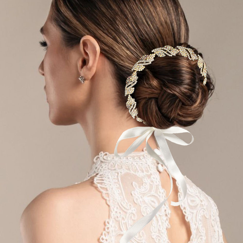• Elegant crystal leaf vine bridal hair vine headpiece designed with sparkling rhinestones in a flowing pattern. Flexible and lightweight, perfect for weddings, proms, and special occasions to enhance any hairstyle.