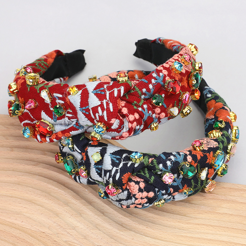 Flower Embroidered Stone Cluster Embellished Knot Headband