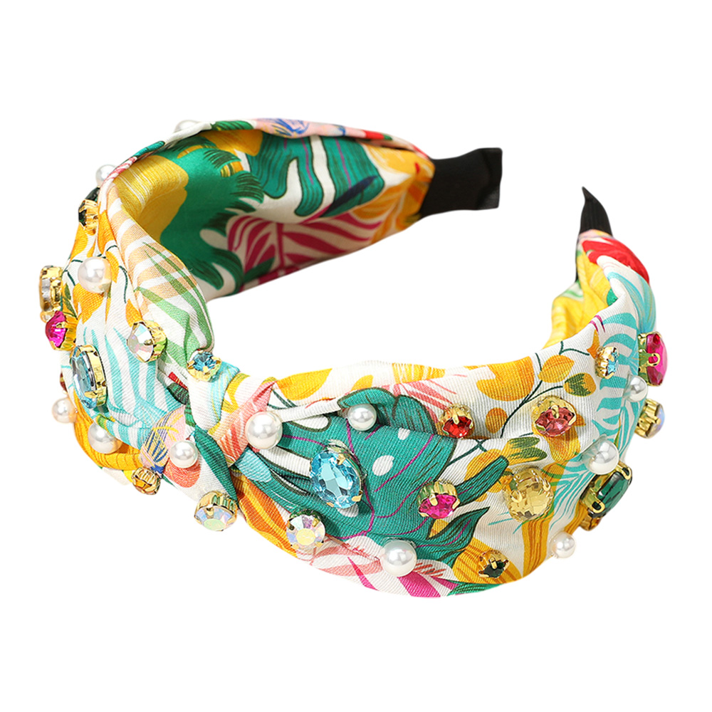 Stone Cluster Pearl Embellished Flower Printed Knot Headband