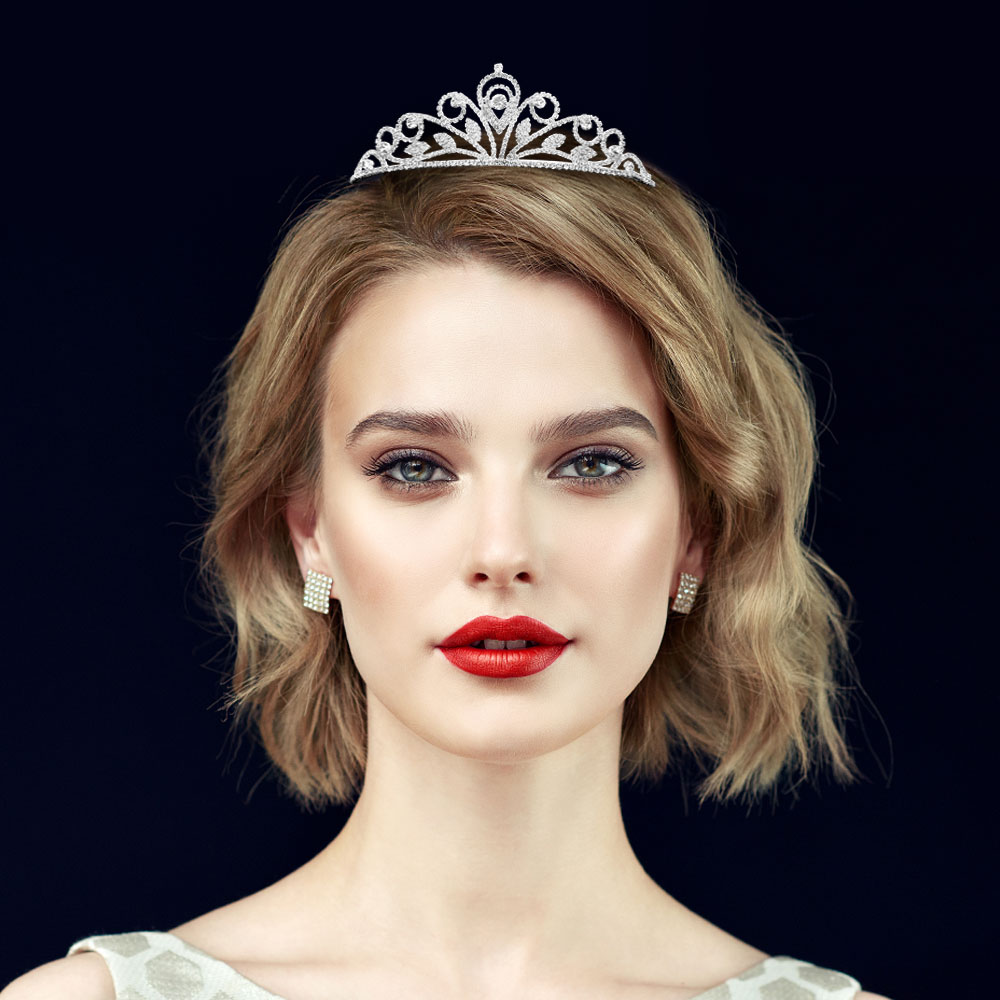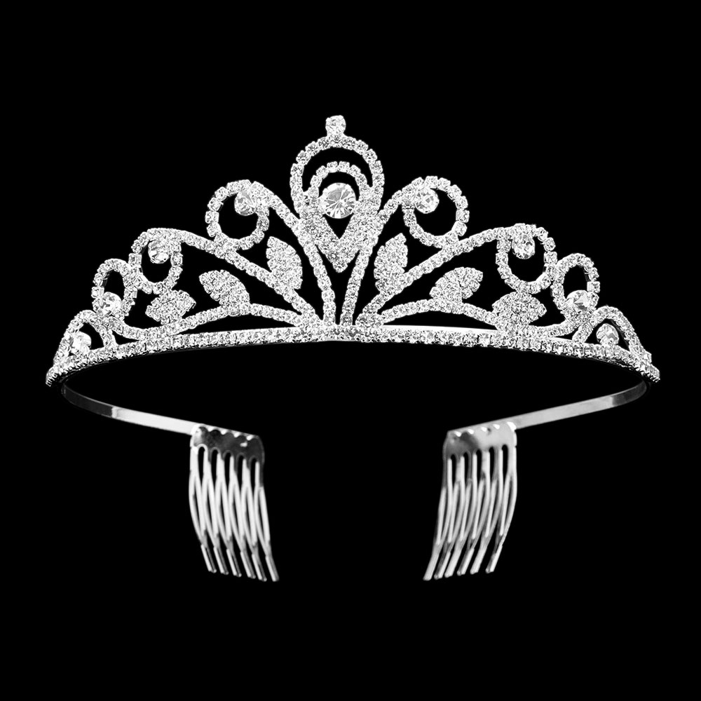 • Shine with this rhinestone tiara featuring a round centerpiece, leaf accents, and elegant swirling crown design. Perfect for weddings, proms, and pageants, this sparkling headpiece adds regal charm and sophistication to your special occasion look.