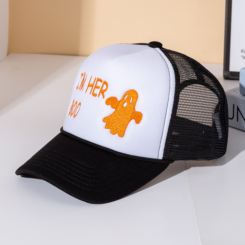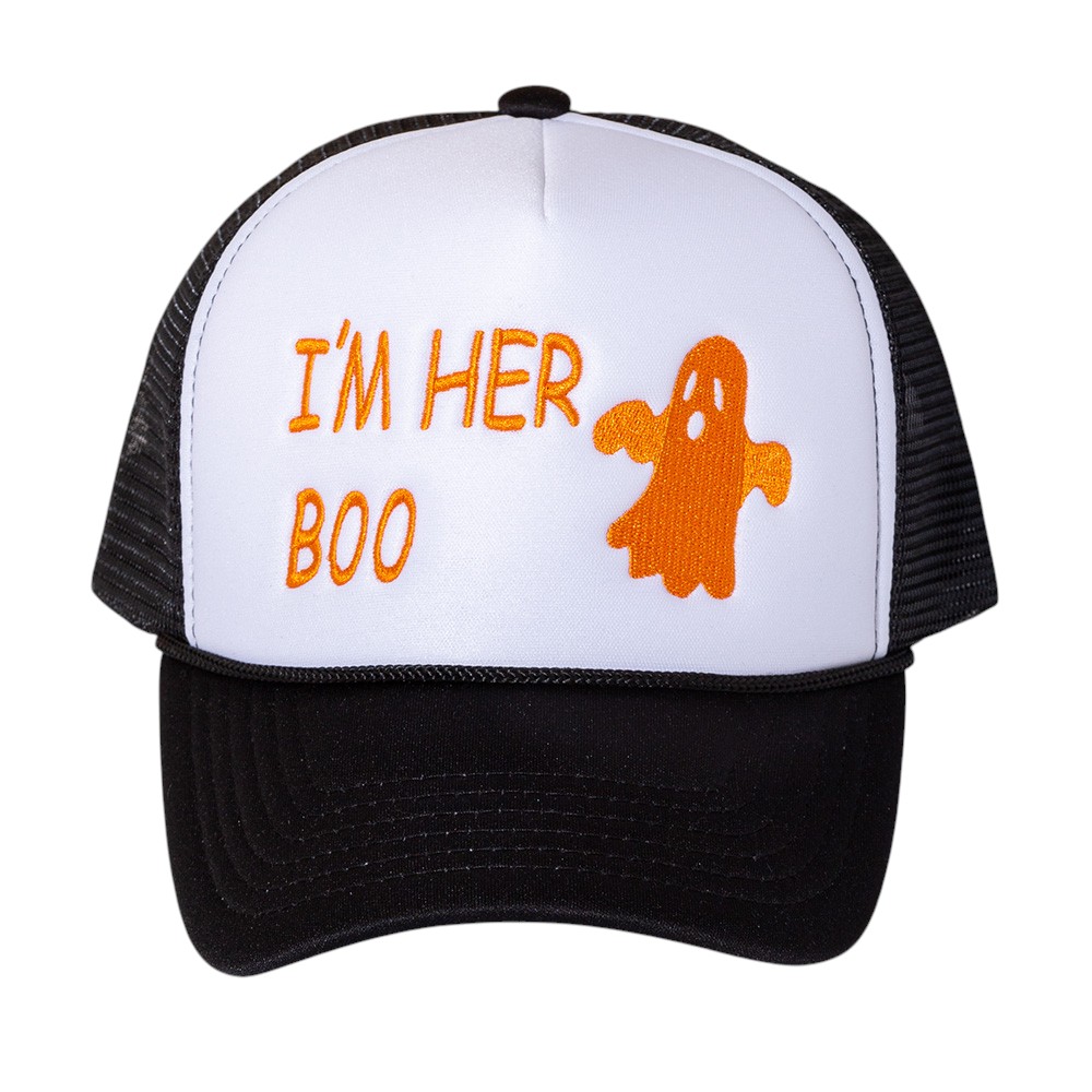 • Halloween trucker cap with embroidered “I’M HER BOO” and ghost design, perfect for spooky season fun. Lightweight with breathable mesh back, this adjustable novelty hat makes a festive couple’s accessory, party gift, or casual statement piece for October outfits, trick-or-treating, or themed events.