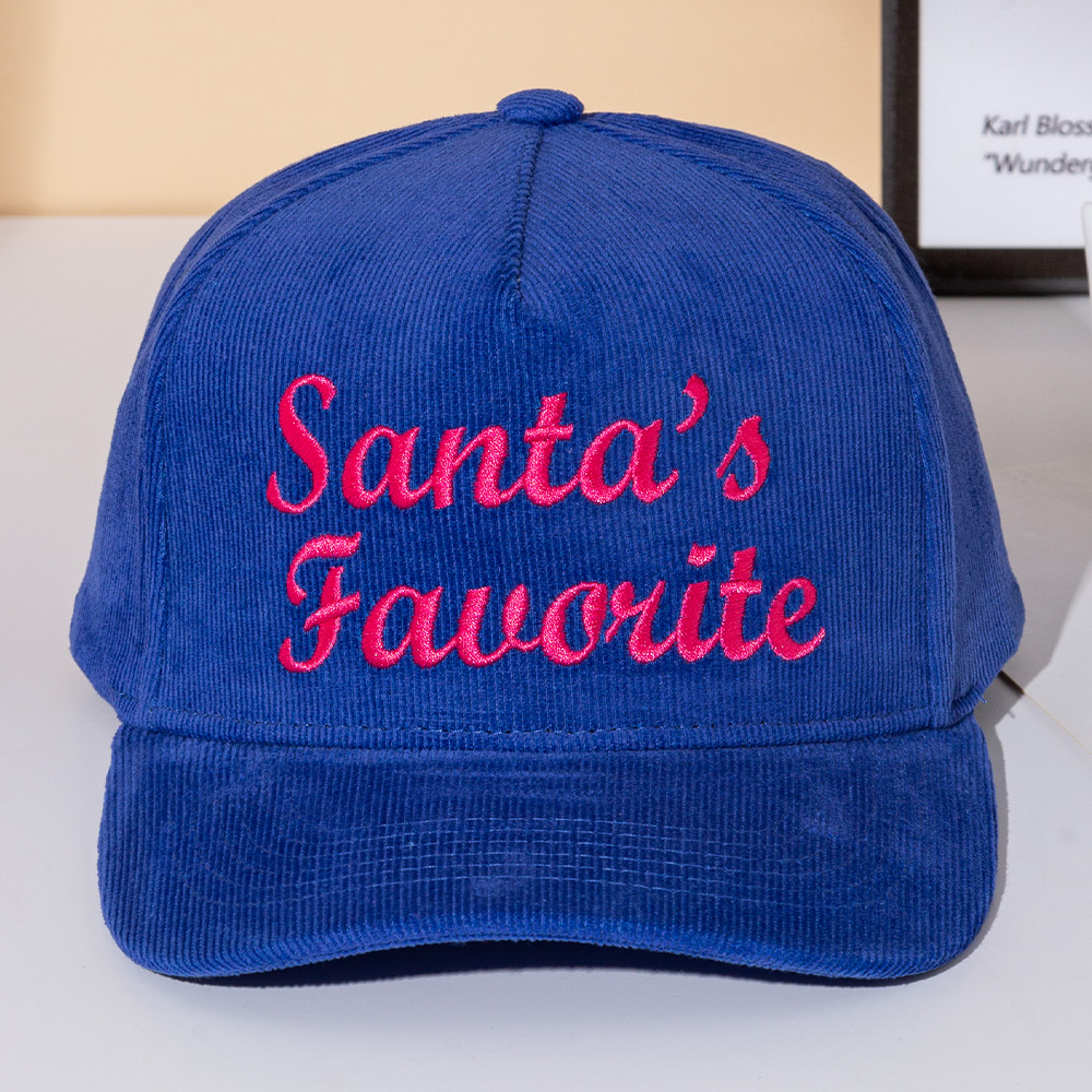 Details • Size : One Size Fits All - Adjustable Strap Makes Fit Comfortable • 5 Panel Canvas Cap : Adjustable Buckle Closure, Relaxed Fit and Pre-Curved Visor • This Corduroy K-Frame 5 Panel Hat is a must-have addition to any hat collection. Made with high-quality corduroy, this 5 panel hat has a sophisticated and stylish look. The sturdy material provides both durability and comfort, making it perfect for everyday wear. Upgrade your headwear game with this classic and versatile corduroy baseball hat. • Fun holiday cap embroidered with the playful phrase “Santa’s Favorite.” A festive accessory for Christmas parties, family gatherings, or seasonal outfits. Adjustable fit makes it comfortable for all-day wear and a perfect novelty gift to spread cheer and show holiday spirit in a bold, fun way.