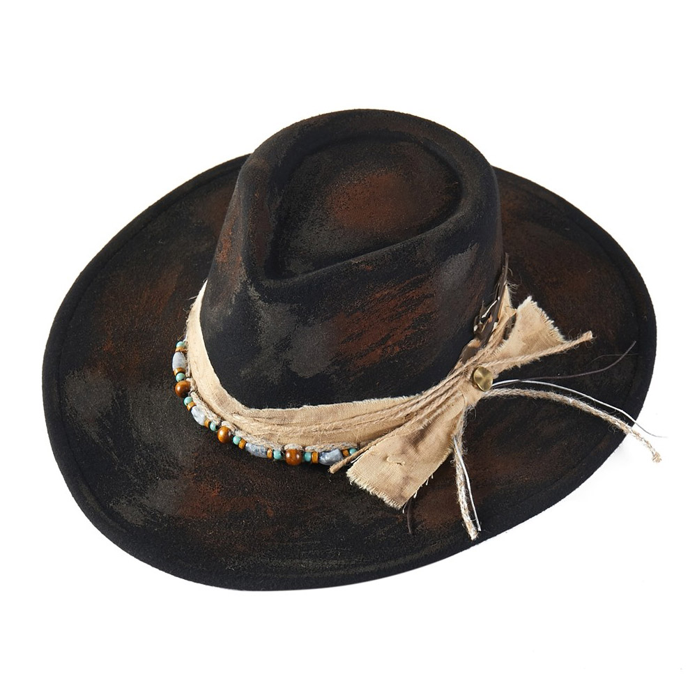 Details • Crown Circumference : 23" • Crown Height : 4.5" • Brim Height : 3.75" • Material : 100% Polyester • Showcase rugged elegance with the Distressed Western Hat featuring a handcrafted beaded trim and rustic fabric band. Its vintage finish delivers authentic character and standout charm, perfect for festivals, outdoor adventures, or casual wear with timeless western appeal.
