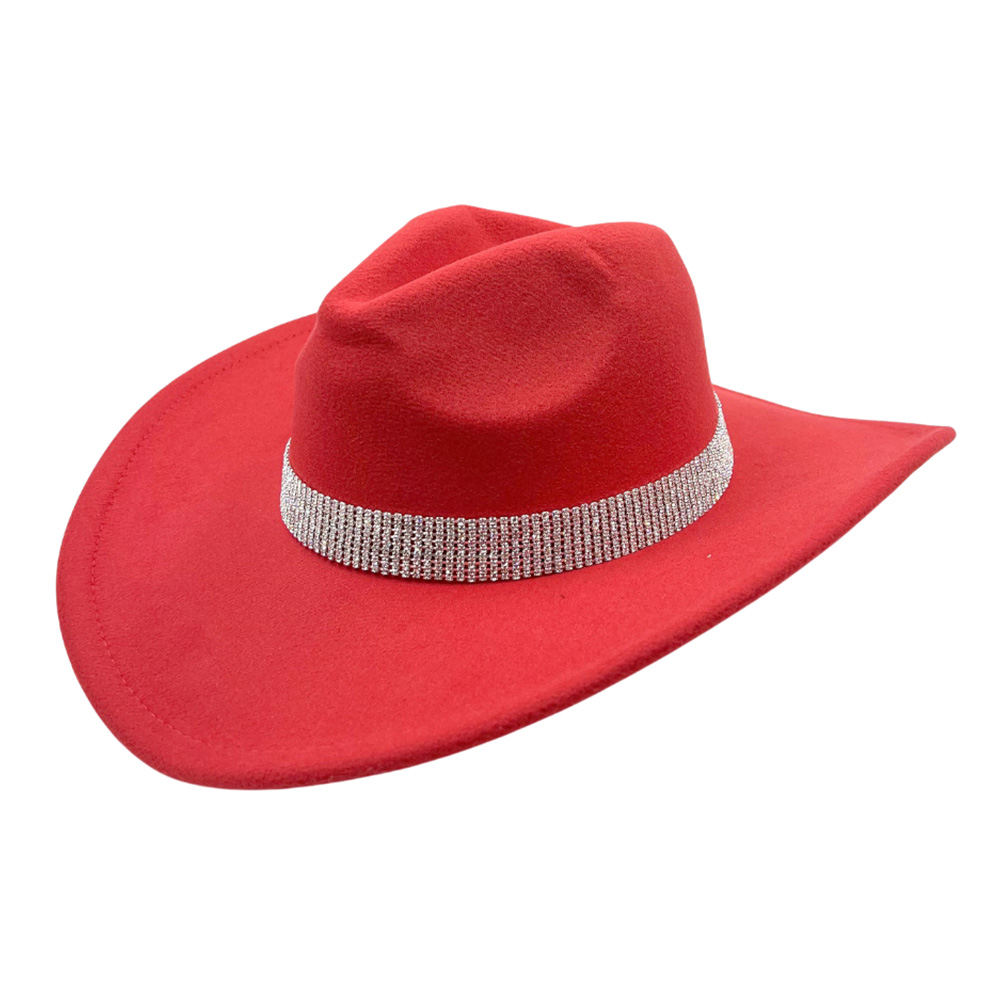 Details • Crown Circumference : 23" • Crown Height : 4.75" • Brim Height : 3.5" • Material : 100% Polyester • Make a striking impression with this wide-brim statement cowboy fedora hat featuring a glimmering crystal band. Designed for timeless elegance and modern sophistication, it adds a touch of glamour to any outfit—perfect for upscale events, travel, or fashionable daywear.