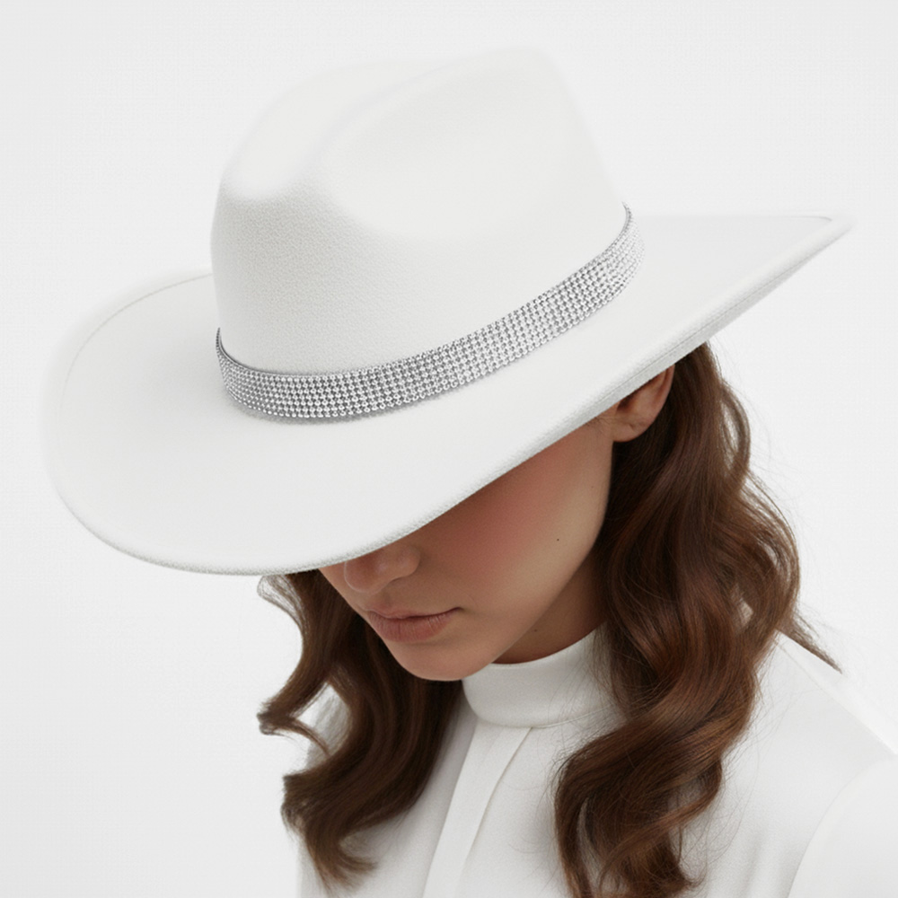 • Make a striking impression with this wide-brim statement cowboy fedora hat featuring a glimmering crystal band. Designed for timeless elegance and modern sophistication, it adds a touch of glamour to any outfit—perfect for upscale events, travel, or fashionable daywear.