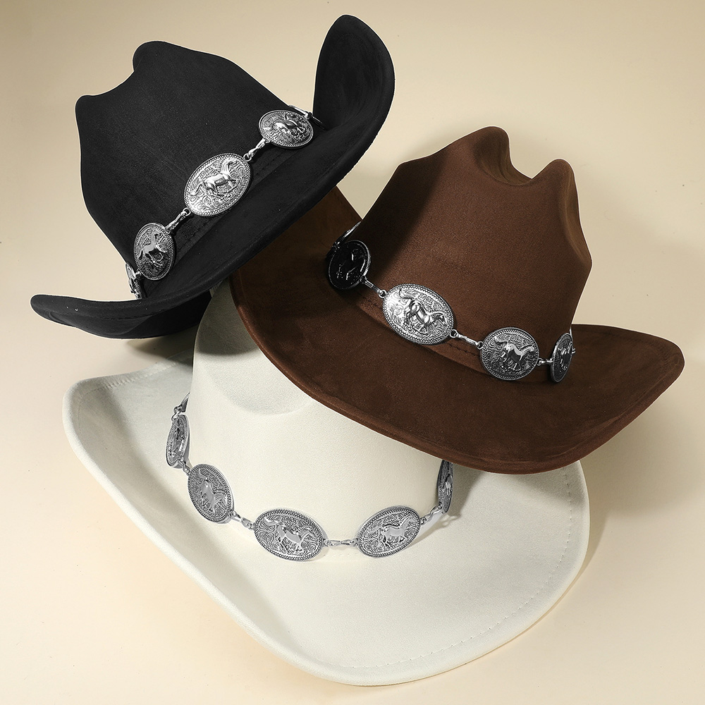 Details • Crown Circumference : 23" • Crown Height : 4.75" • Brim Height : 3.75" • Material : 100% Polyester • Classic cowboy hat featuring an oval concho chain band with engraved rodeo-inspired details. Designed for rodeos, concerts, festivals, or everyday western wear, this bold hat brings authentic cowboy style with a durable design and striking concho accents for standout western fashion.