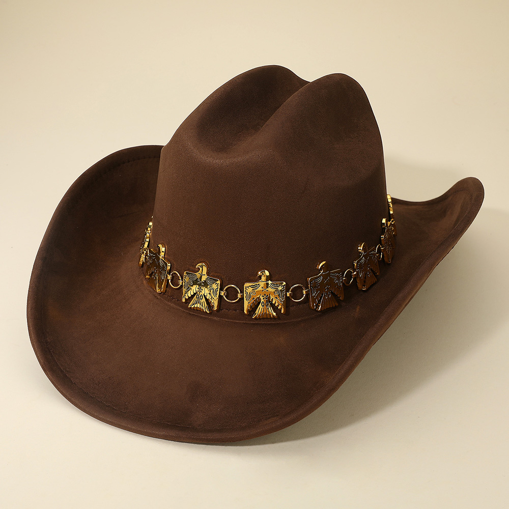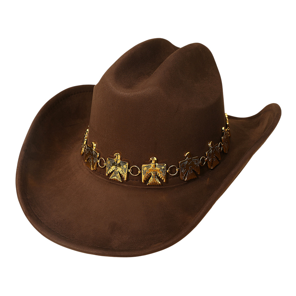 • Western cowboy hat detailed with a bold eagle concho chain band, blending rugged charm with symbolic style. Perfect for rodeos, festivals, concerts, and everyday western fashion, this statement hat offers durability and standout design for anyone who loves authentic cowboy flair.