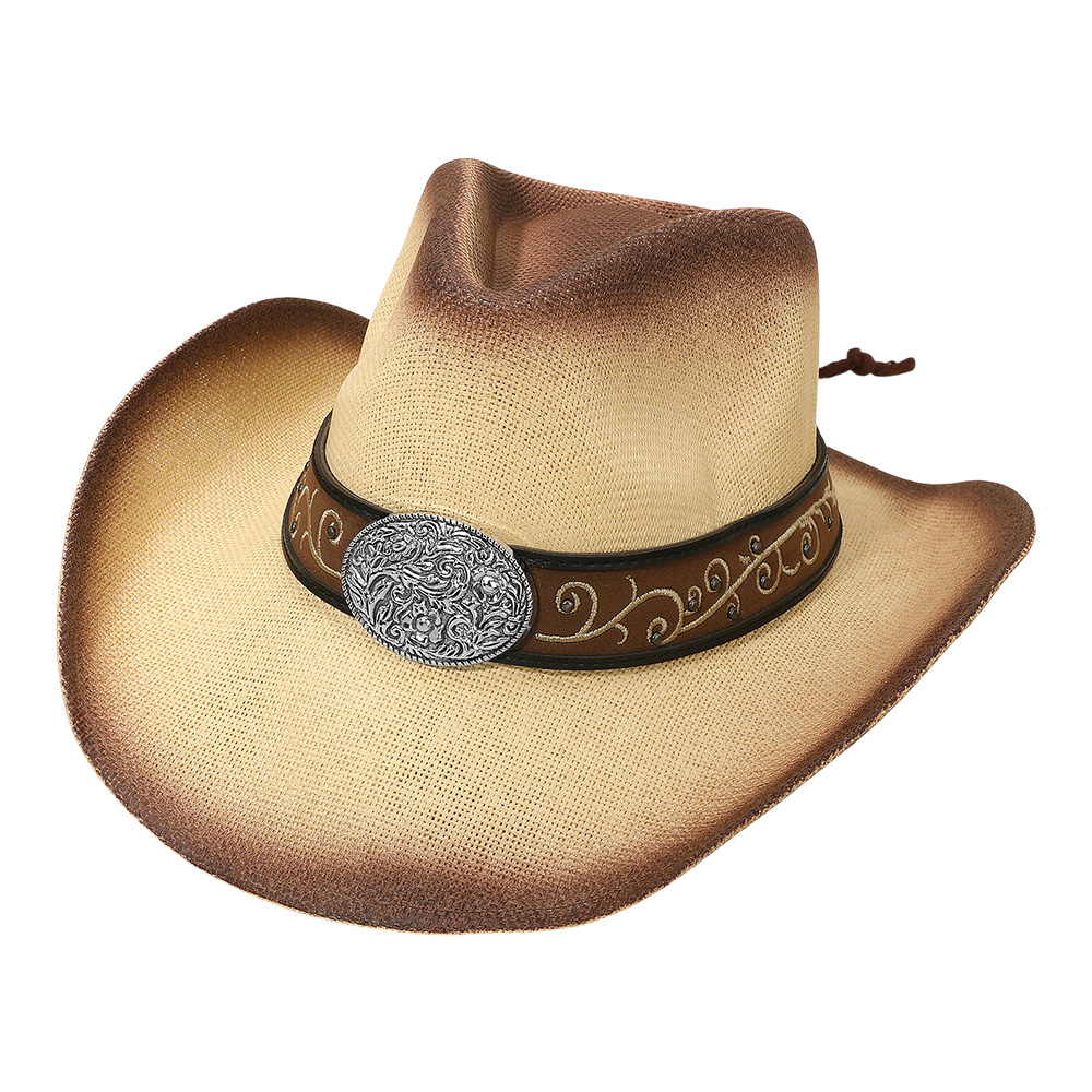 Details • Crown Circumference : 23" • Crown Height : 4.75" • Brim Height : 3.75" • Material : 98% Rayon, 2% Polyester • Capture authentic western style with this cowboy hat featuring a tooled band and ornate silver concho. Perfect for rodeos, concerts, or casual outings, it blends rugged tradition with refined details, making it a versatile accessory for any cowboy-inspired look.