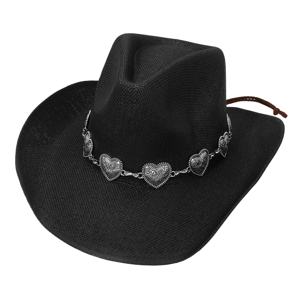 Details • Crown Circumference : 23" • Crown Height : 4.75" • Brim Height : 3.75" • Material : 98% Rayon, 2% Polyester • Turn heads with this cowboy hat featuring a band of intricate heart conchos for a unique western look. Ideal for concerts, festivals, or casual wear, it combines rustic charm with eye-catching detail, making it the perfect accessory for a bold and stylish statement.