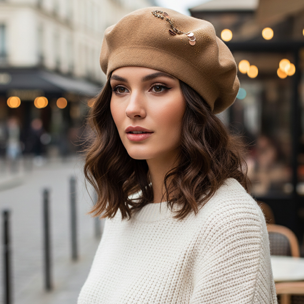 Details • Size : One Size • Material : 100% Acrylic • Chic beret featuring a subtle decorative accent, perfect for adding a touch of Parisian flair to everyday outfits. Stylish and versatile, this accessory elevates casual and dressy looks with timeless charm and effortless elegance.