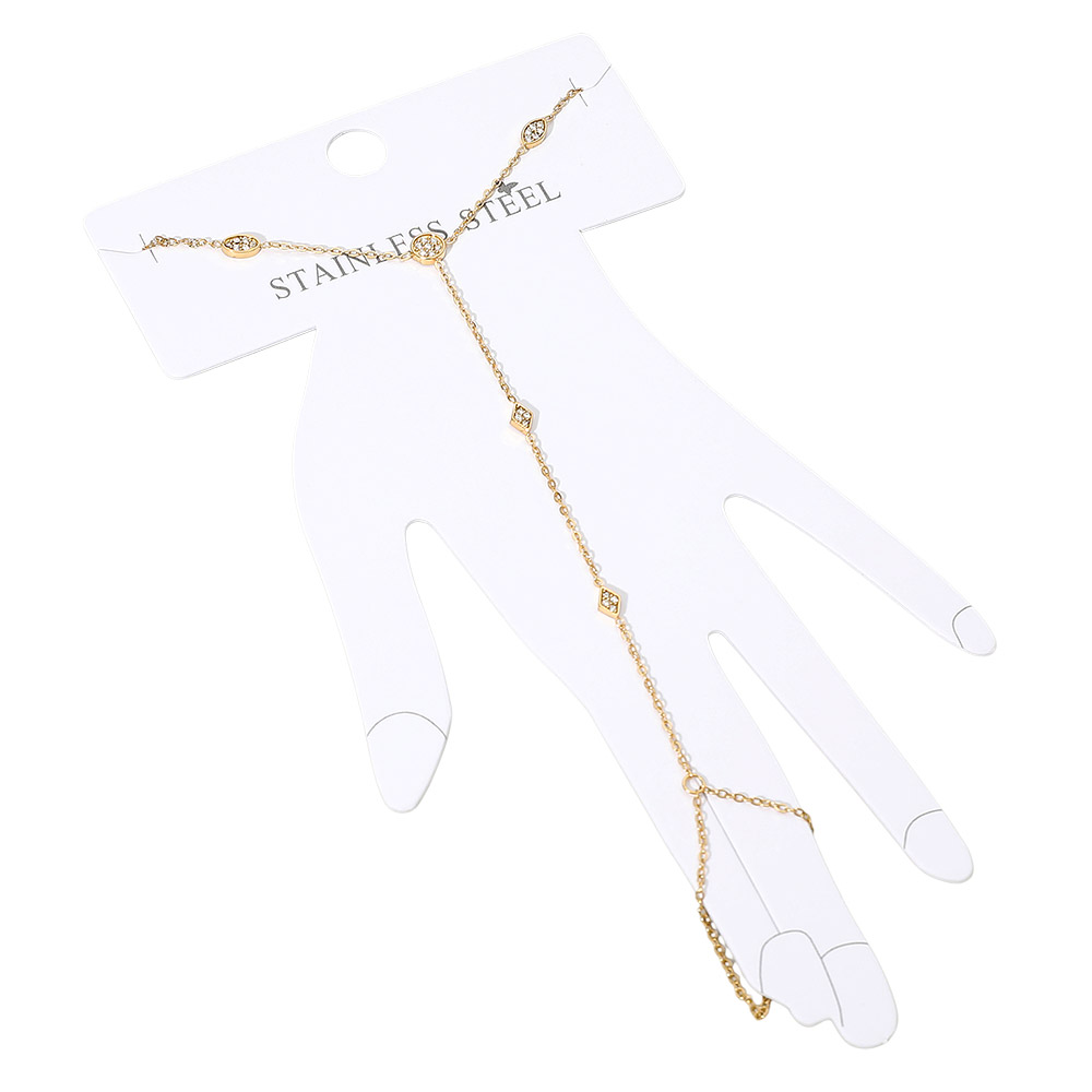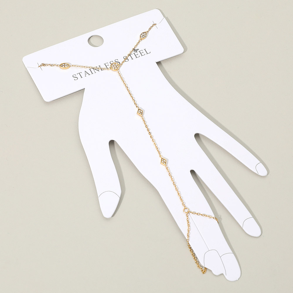 Details • Size : 3.75" H, 6.75" + 1" L • Ring Size : Free • Stylish hand chain bracelet featuring a delicate linked design that drapes gracefully from wrist to finger. Lightweight and refined, it adds a touch of elegance to everyday looks or special occasions. A chic accessory that highlights your personal style with subtle sparkle. • Stainless Steel