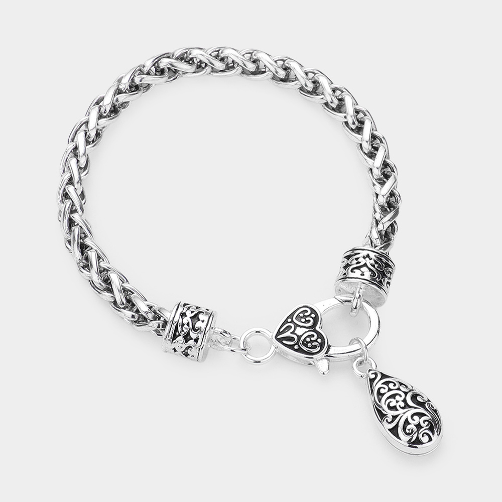 Stainless Steel Stone Paved Heart Charm Beaded Stretch Bracelet