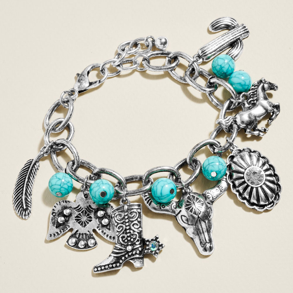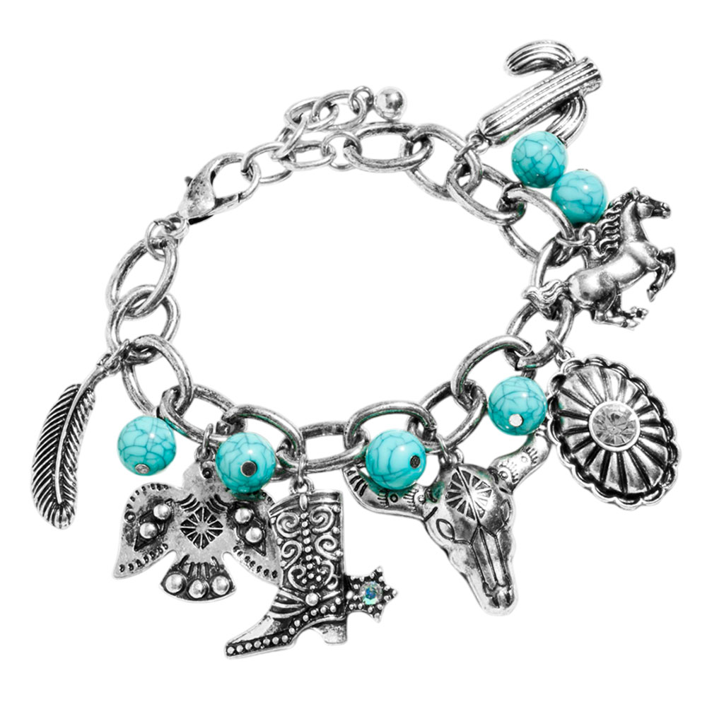 Details • Size : 0.5" H, 7.5" + 2" L • Charm Size : 1.25" L • Lobster Clasp Closure • Statement link bracelet featuring bold hanging motifs inspired by frontier style, designed to add character to everyday outfits or special occasions. Ideal for stacking, gifting, festivals, casual wear, and collectors seeking a distinctive accessory that stands out with playful charm detailing. • Lead and Nickel Compliant