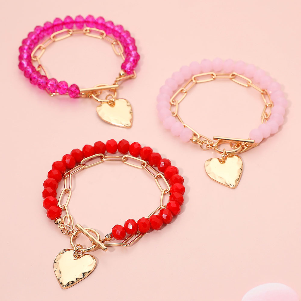 Hammered Metal Heart Charm Beaded Paperclip Chain Layered Toggle Bracelet