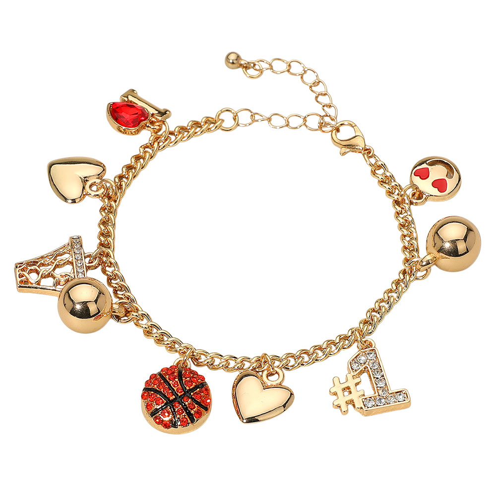 Details • Size : 0.2" H, 7" + 2" L • Charm Size : 0.9" L • Lobster Clasp Closure • Basketball charm bracelet featuring playful pendants including hoop, ball, hearts, emoji, and #1 charm. Adjustable chain for a secure fit. A fun accessory for sports fans, gameday wear, or thoughtful sporty gifts. • Lead and Nickel Compliant