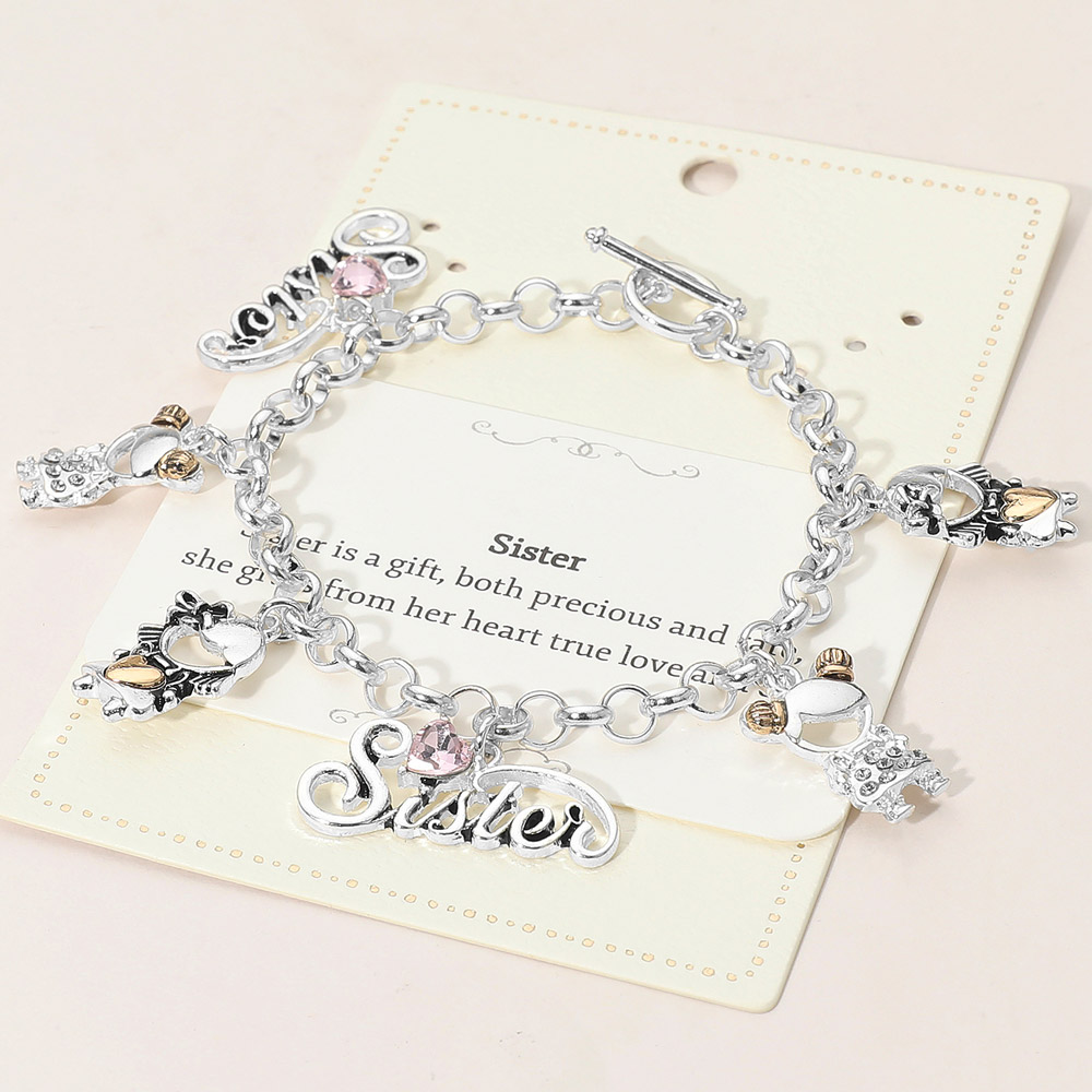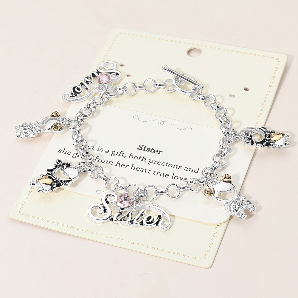 Details • Size : 1.2" H, 8" L • Toggle Closure • Celebrate sisterly bonds with this charm link bracelet featuring playful letter accents and symbolic hanging details. Designed for everyday elegance and meaningful gifting, it offers comfortable wear and timeless appeal, perfect for birthdays, holidays, or expressing appreciation. • Lead and Nickel Compliant