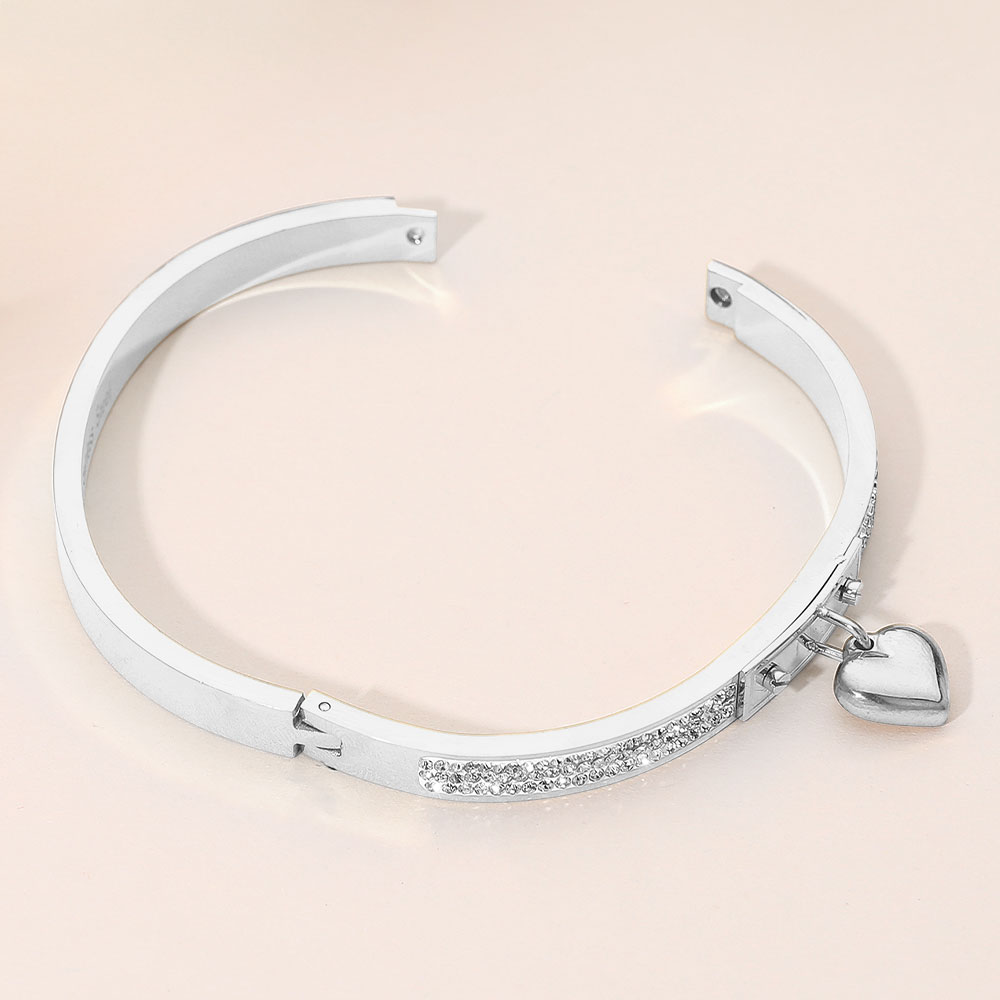 Details • Size : 0.25" H, 2.3" D • Charm Size : 0.6" L • Hinged Closure • Sleek bangle featuring a dangling heart charm with subtle sparkle accents for a romantic, modern look. Comfortable for daily wear and easy to layer or style solo, making it a versatile accessory for gifting, date nights, or elevating everyday outfits. • CZ Cubic Zirconia • Stainless Steel