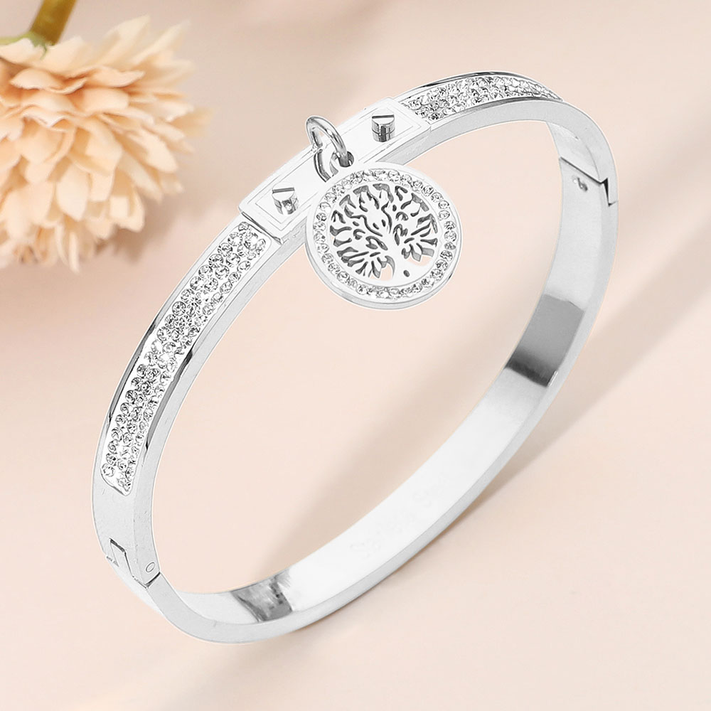 Stainless Steel Tree of Life Charm Accent CZ Stone Paved Hinged Bangle Bracelet