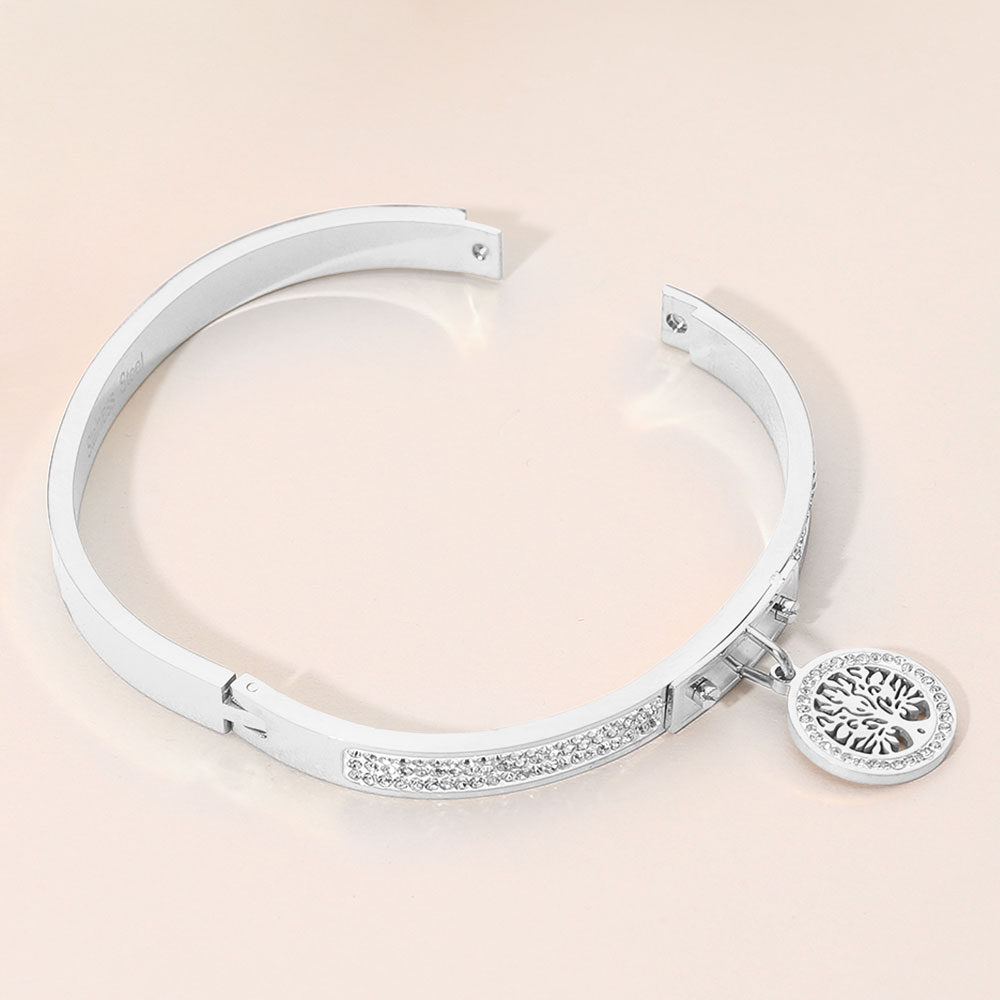 Details • Size : 0.25" H, 2.3" D • Charm Size : 0.75" L • Hinged Closure • Elegant bangle bracelet featuring a symbolic Tree of Life charm with sparkling accents. Designed for effortless everyday wear or meaningful gifting, it layers beautifully with other pieces or shines alone as a refined statement accessory for any style. • CZ Cubic Zirconia • Stainless Steel
