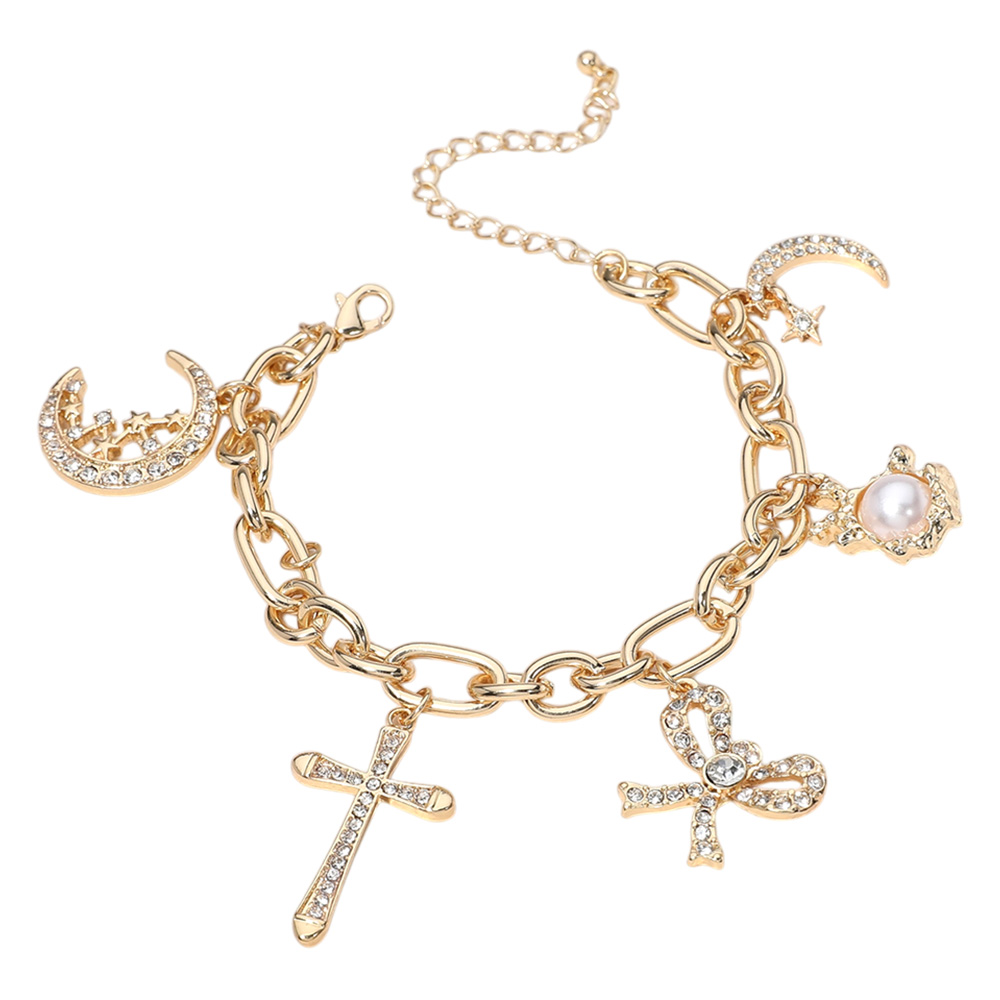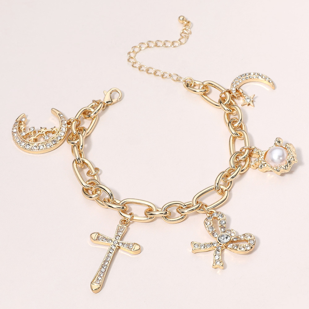 Stone Paved Crescent Cross Bow Pearl Charm Station Chain Bracelet