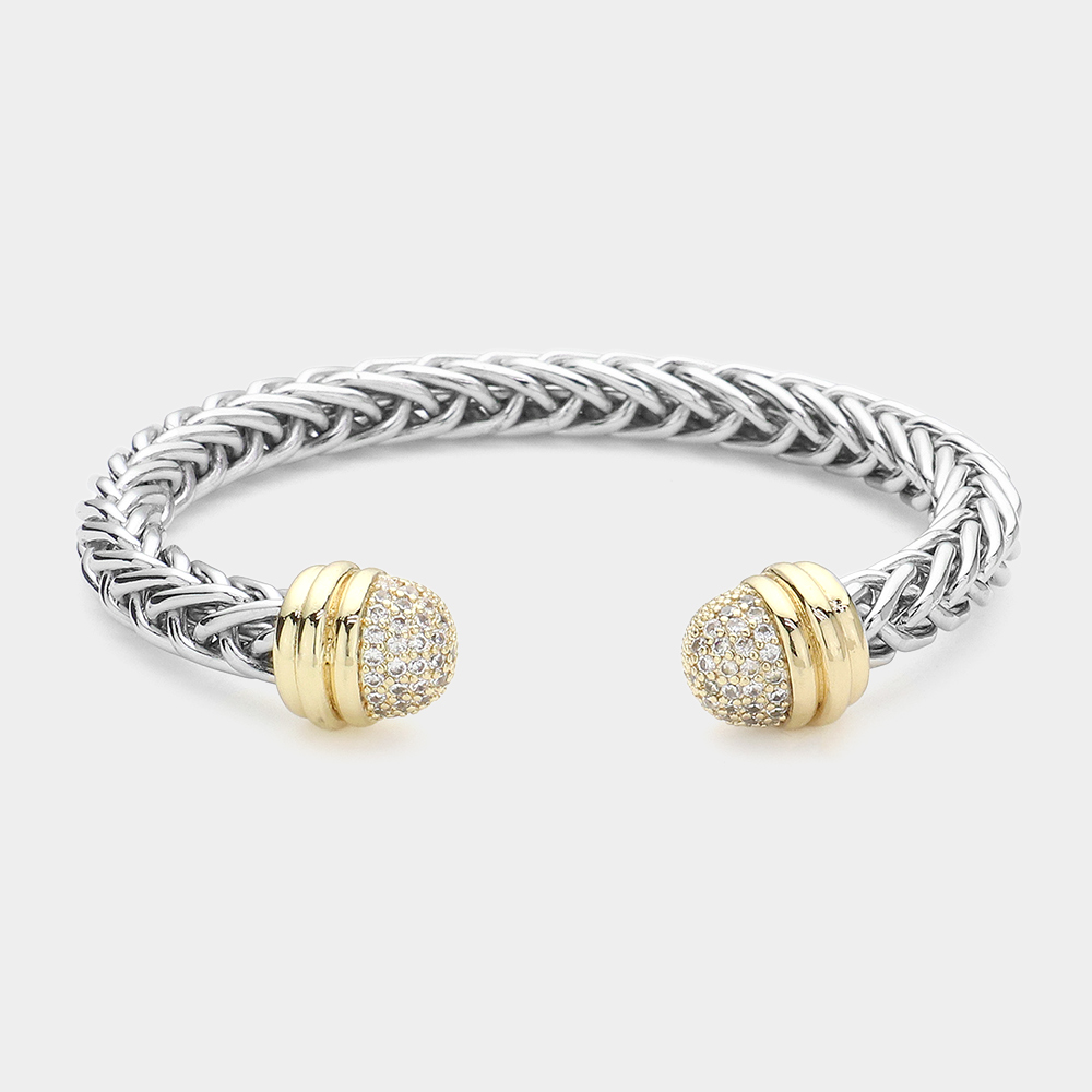 14K Gold Plated CZ Stone Paved Tip Braided Two Tone Cuff Bracelet