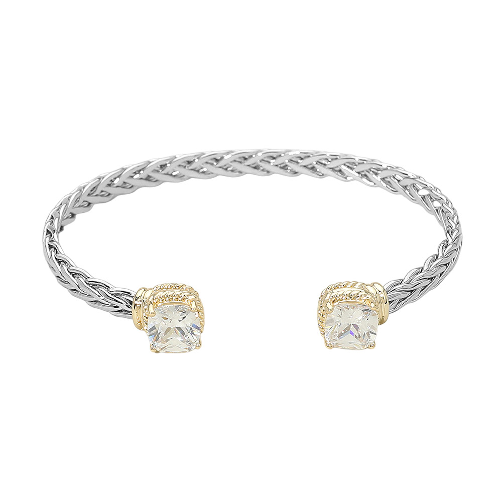 14K Gold Plated CZ Stone Tip Two Tone Braided Cuff Bracelet