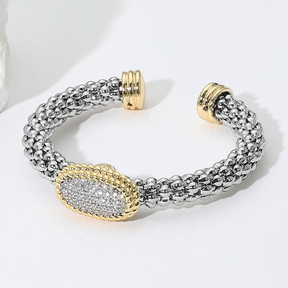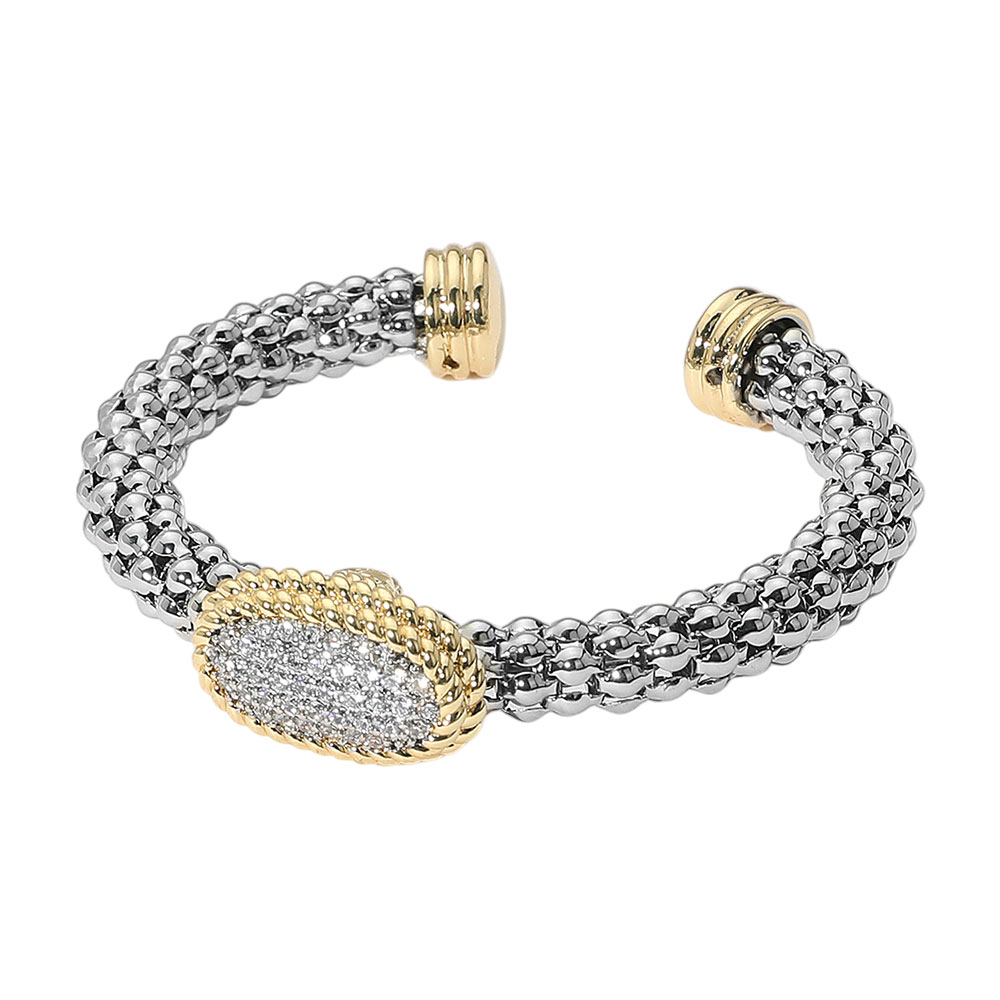 14K Gold Plated Two Tone CZ Stone Paved Oval Accent Cuff Bracelet