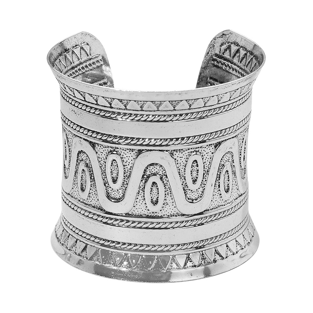 • Bold wide cuff bracelet featuring intricate tribal wave engravings and geometric borders for a striking artisan look. The sculpted open design offers an adjustable fit and adds a touch of vintage-inspired elegance to any outfit, perfect for both casual and statement styling.