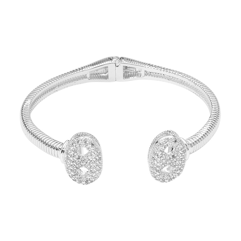 • This elegant pavĂ© cuff bracelet showcases twin oval ends encrusted with dazzling stones for refined sparkle. The hinged structure ensures a secure and comfortable fit, making it a sophisticated accessory that complements both chic daywear and evening elegance effortlessly.