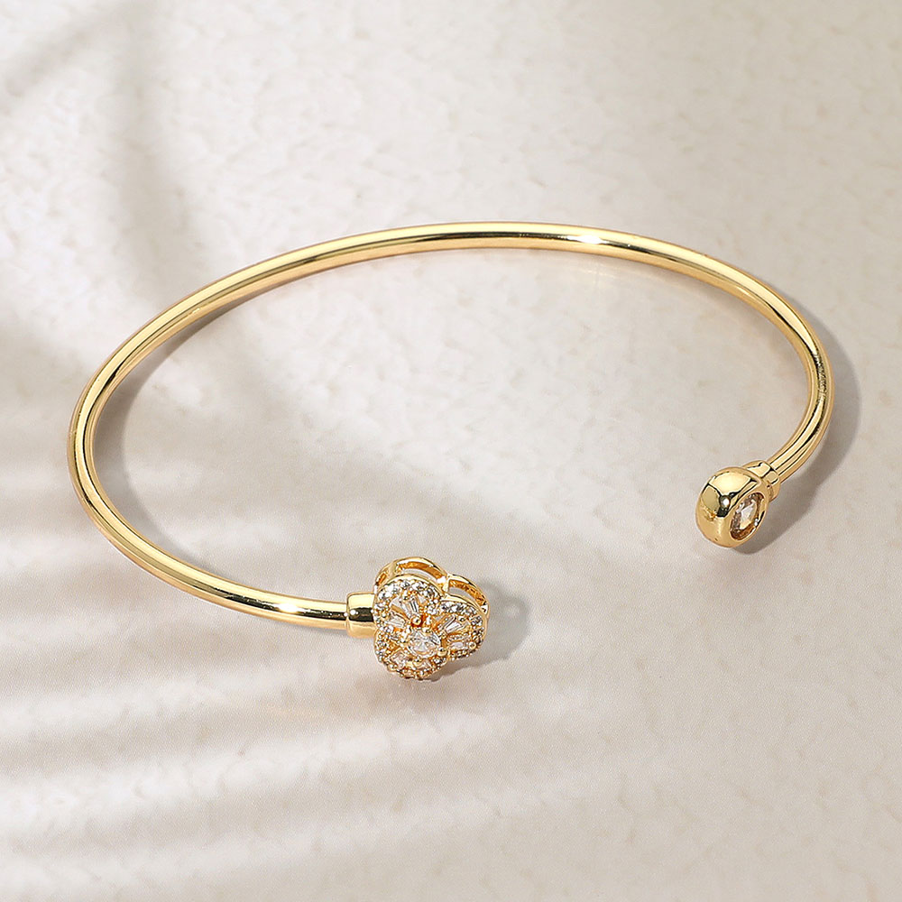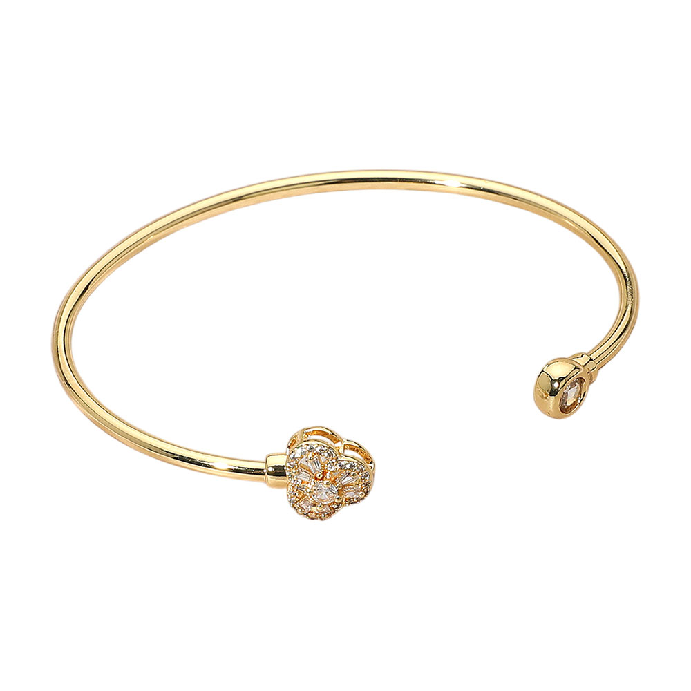 Details • Size : 0.4" H, 2.5" D • Cuff • Delicate open cuff bracelet featuring a sparkling crystal heart accent. Perfect for adding a touch of romance to everyday wear or gifting as a symbol of love and elegance for special occasions. • Gold Dipped • CZ Cubic Zirconia