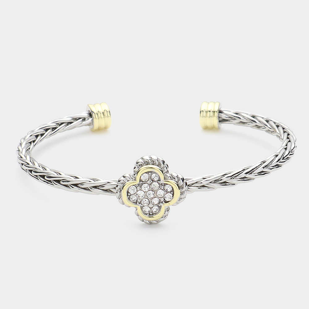 Stone Paved Quatrefoil Pointed Two Tone Braided Metal Cuff Bracelet