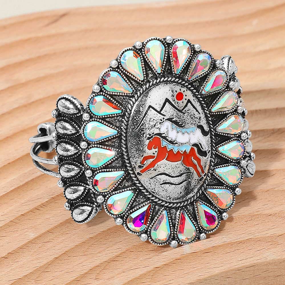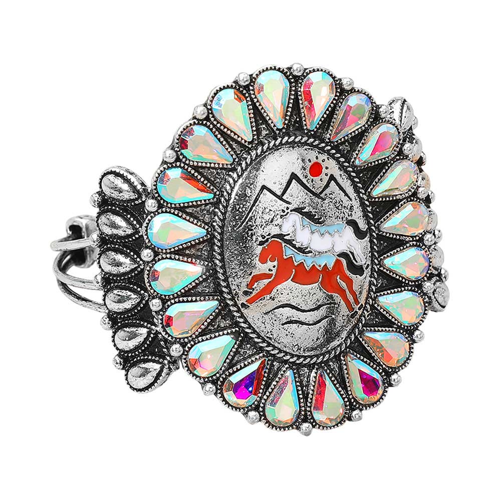 • Make a bold style statement with this western-inspired horse oval cuff bracelet featuring an intricate central motif framed by stone-look accents. The adjustable open design offers comfortable wear while delivering standout visual appeal for casual outfits, festivals, or themed styling.
