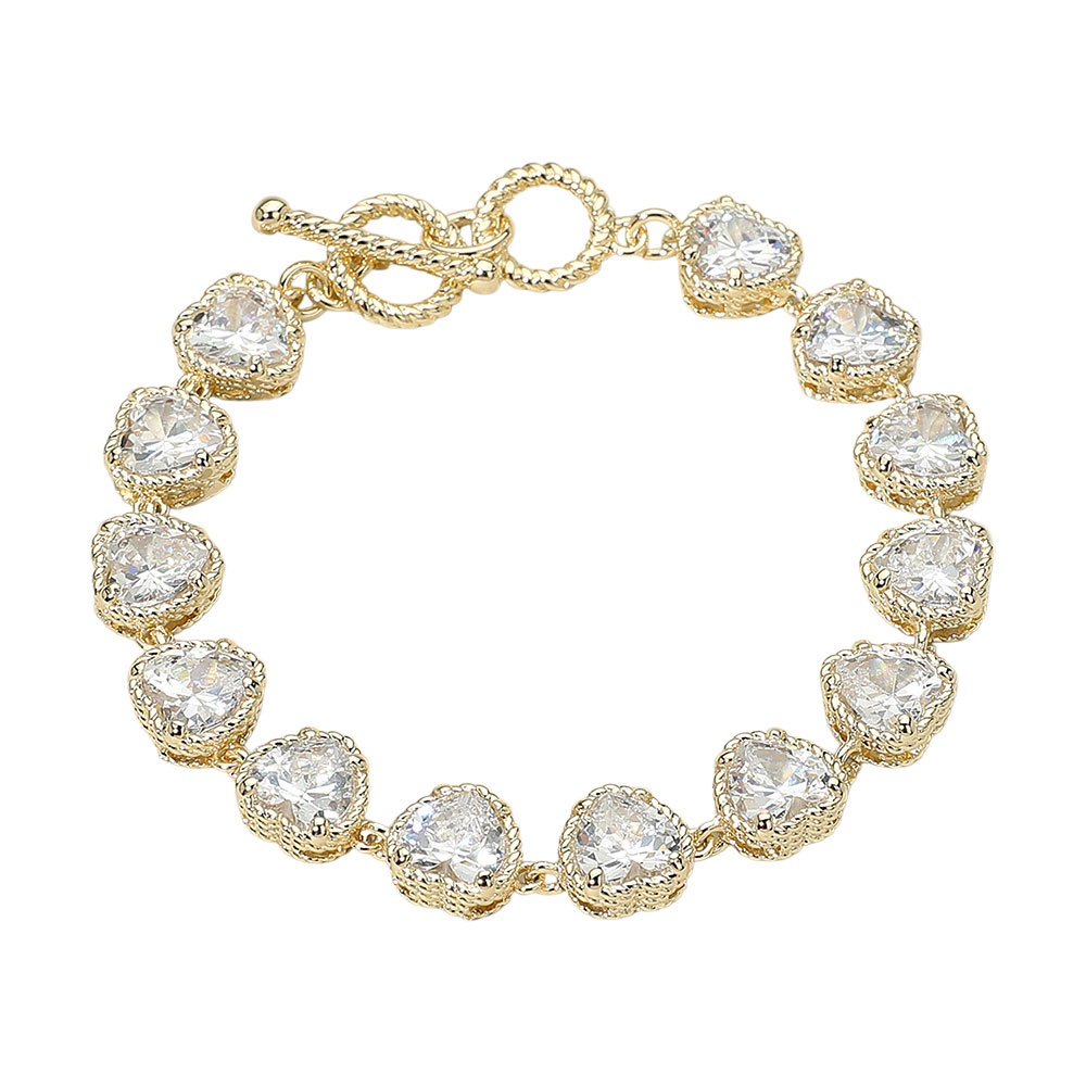 Details • Size : 0.3" H, 7" + 1" L • Toggle Closure • Showcase timeless romance with this bracelet featuring sparkling heart-cut crystals in a delicate linked setting. Its refined design captures light beautifully, making it the perfect accessory for adding elegance and charm to everyday wear or special celebrations. • Gold Dipped • CZ Cubic Zirconia