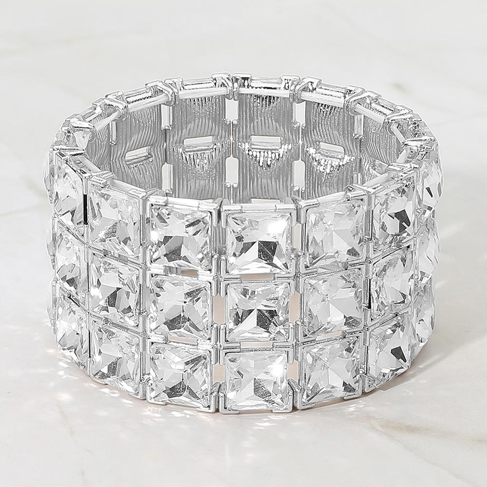 Details • Size : 1.5" H, 2.25" D • Stretchable • Make a striking statement with this square-cut crystal stretch bracelet designed for standout brilliance and effortless wear. Its bold, structured layout adds refined sparkle to evening looks or event ensembles, offering a glamorous finishing touch that catches every light beautifully.