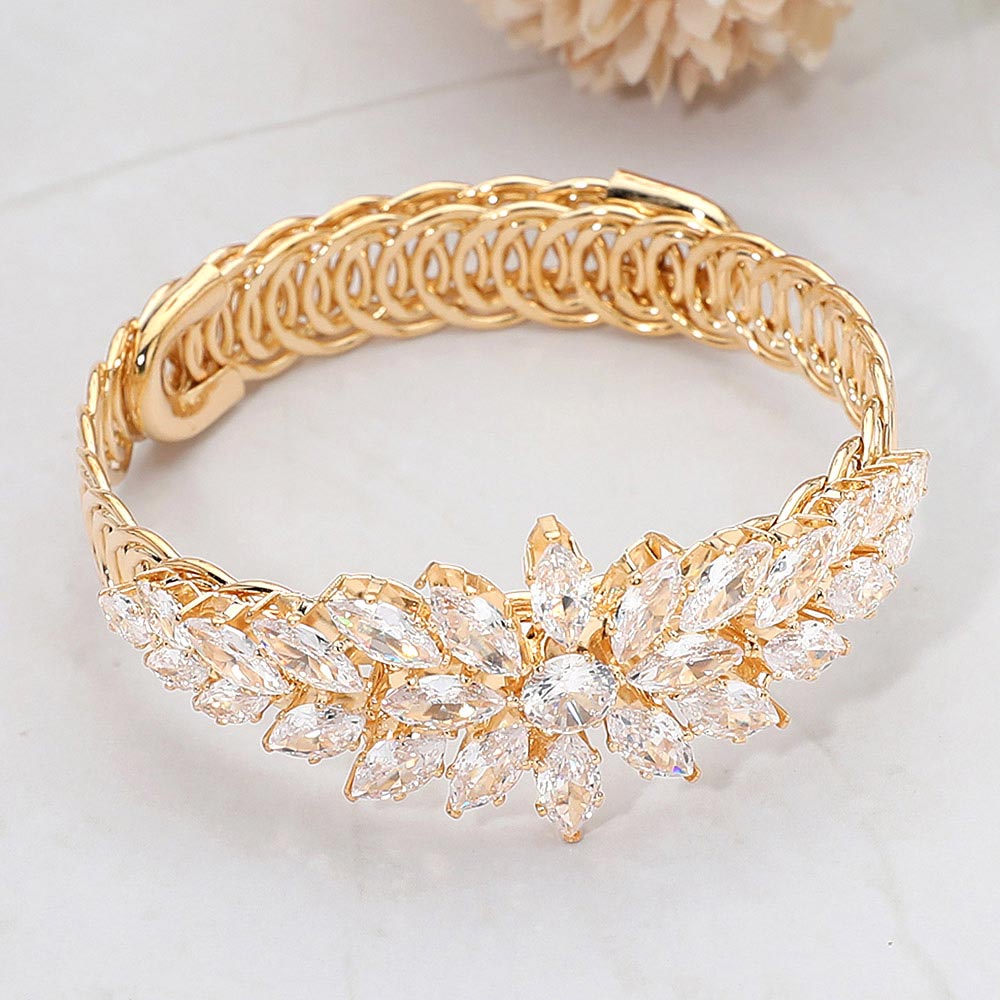 Details • Size : 0.9" H • Adjustable • Stunning bracelet featuring marquise-cut crystal clusters arranged in a refined floral design with an adjustable band for a comfortable fit. A beautiful accessory for weddings, formal events, and special occasions, adding timeless sparkle to any style. • CZ Cubic Zirconia • Lead and Nickel Compliant