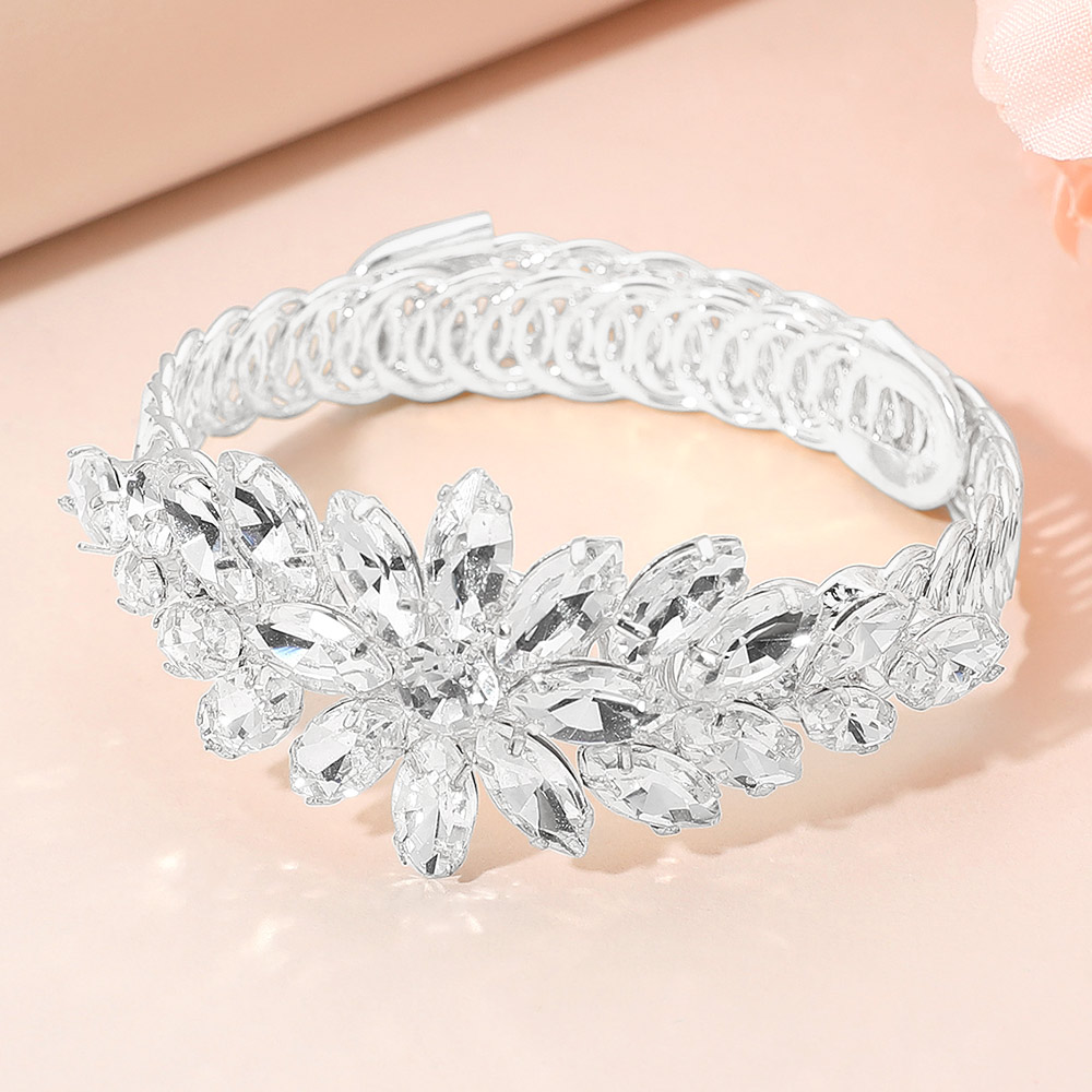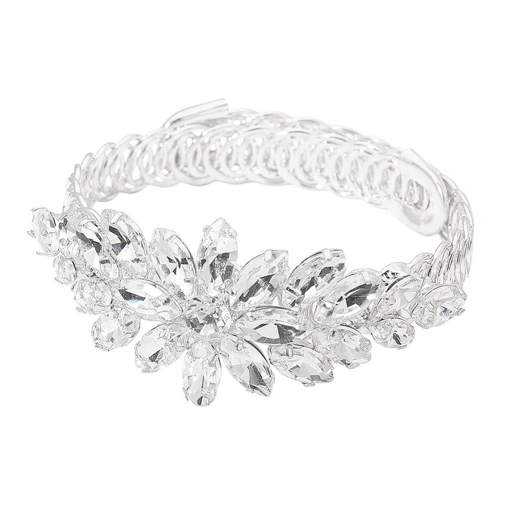 • Shine with elegance in this floral rhinestone stretch bracelet. Designed with dazzling marquise-cut stones arranged in a radiant flower motif, it adds a glamorous sparkle to any look. The flexible band ensures a comfortable fit, making it the perfect accessory for both casual and formal wear.