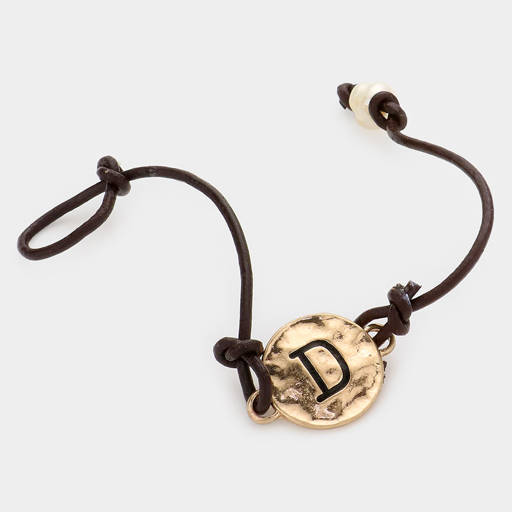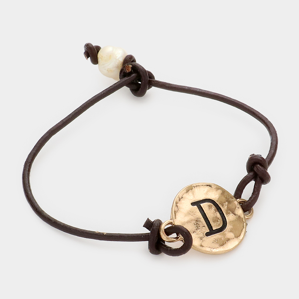 -D- Initial Monogram Metal Disc Pearl Pointed Bracelet