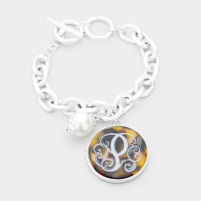 -P- Initial Monogram Pearl Charm Chain Link Bracelet