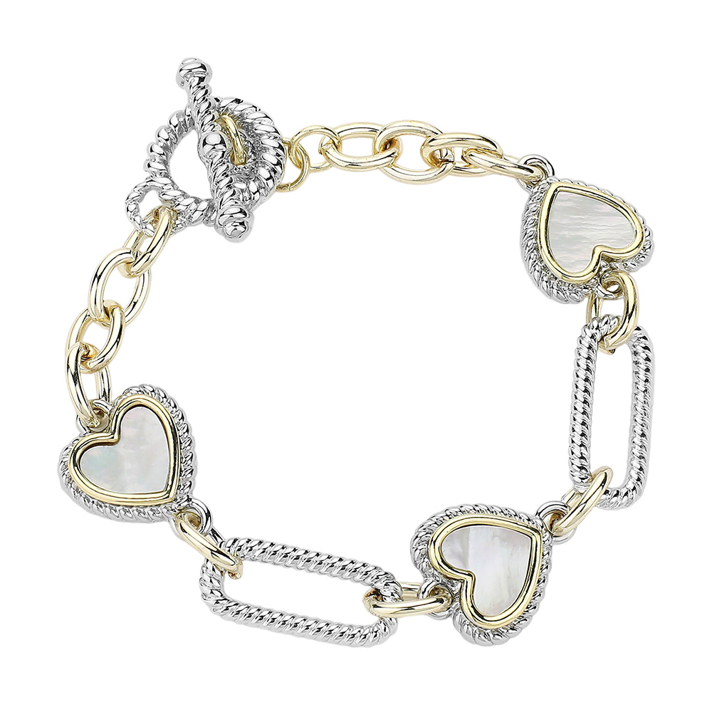 14K Gold Plated Mother Of Pearl Heart Textured Link Toggle Bracelet