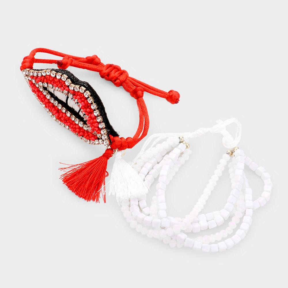 2PCS - Pave Trim Beaded Lips Tassel Adjustable Bracelet