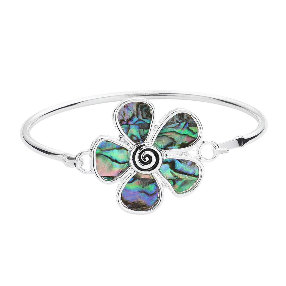 Details • Size : 1.1" H, 2.3" D • Hook Closure • Embrace natural elegance with this abalone flower spiral bangle bracelet. Featuring iridescent floral petals with a central spiral accent, this piece combines artistic charm with a touch of oceanic beauty. Perfect for adding color and sophistication to your everyday or evening style. • Lead and Nickel Compliant