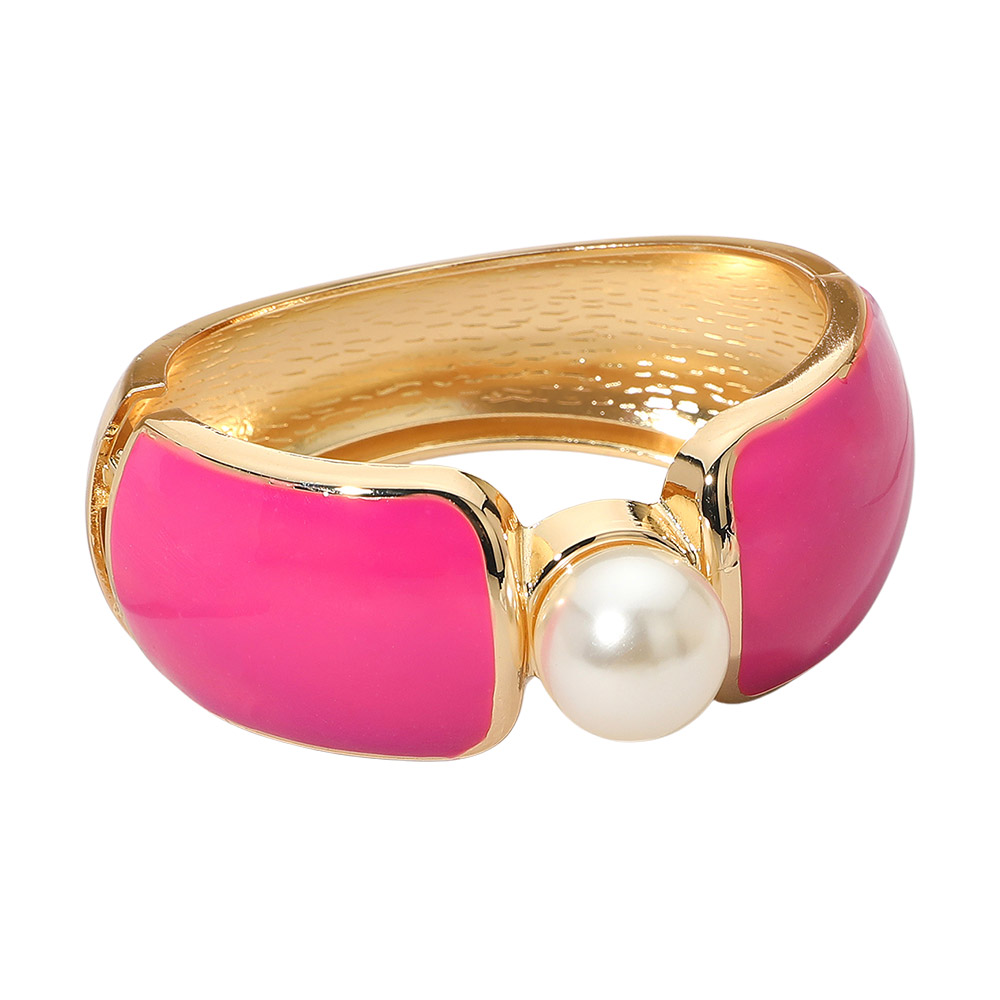 Bold Central Pearl Accent Wide Enamel Hinged Bangle Bracelet