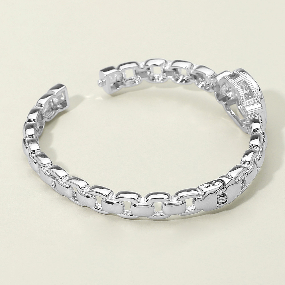 Details • Size : 0.6" H, 2.4" D • Hinged Closure • Sophisticated chain link bangle bracelet designed with a bold square centerpiece adorned in shimmering crystals. A modern statement accessory that adds refined sparkle, perfect for elevating both casual and formal looks. • CZ Cubic Zirconia
