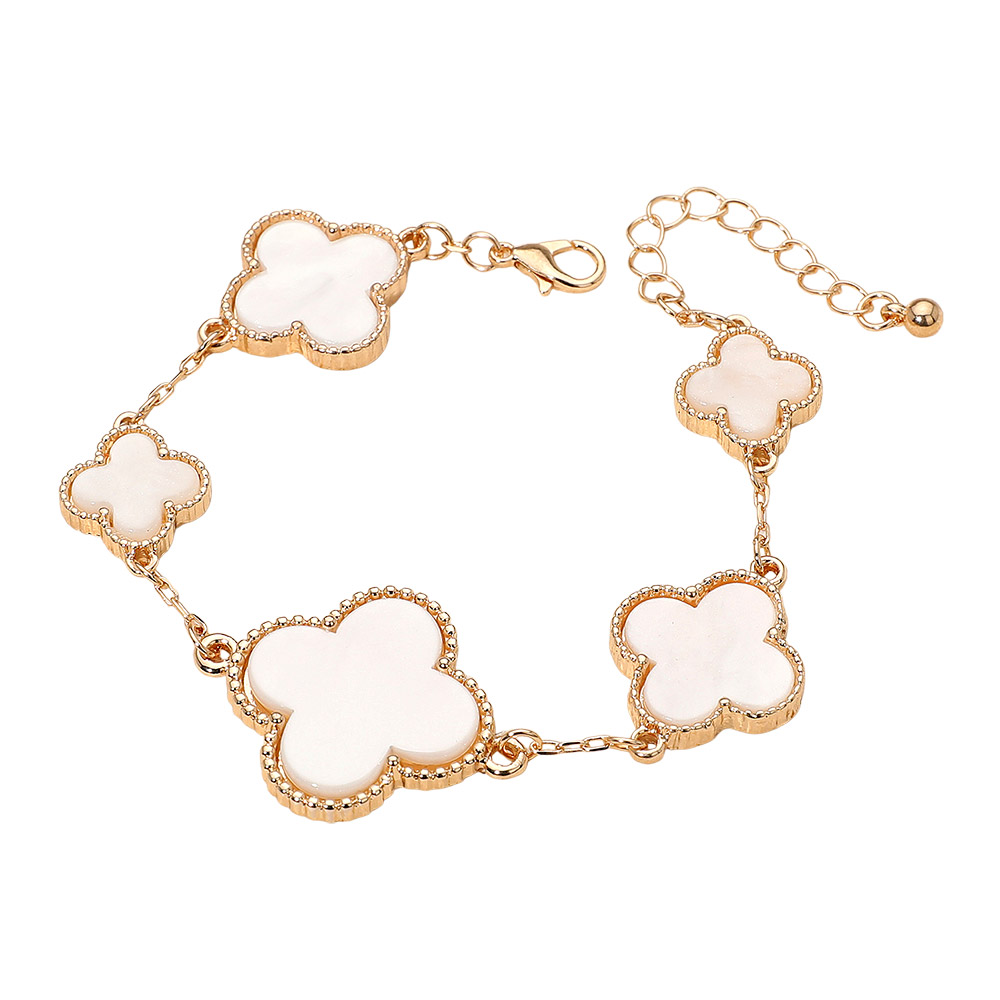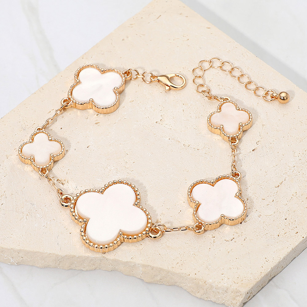 • Chic bracelet featuring five quatrefoil-shaped charms linked along a sleek gold chain. With a mix of small and large motifs, it adds elegance and versatility to any outfit. Perfect for layering or wearing solo, this timeless accessory complements both casual and formal looks effortlessly.