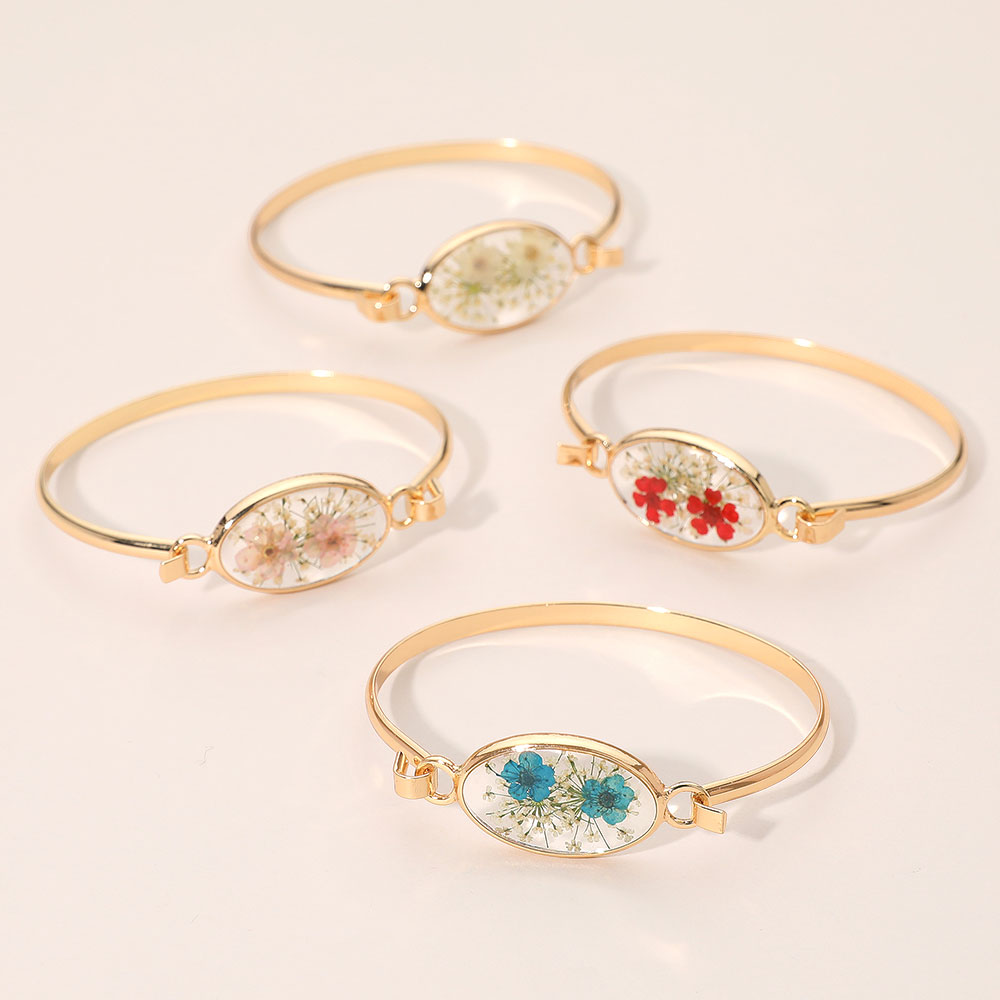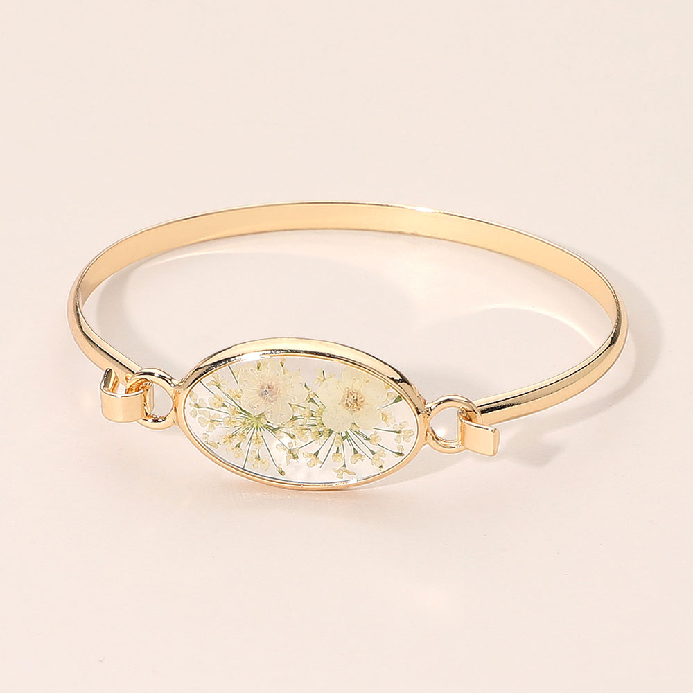 Details • Size : 0.7" H, 2.4" D • Hook Closure • Elevate everyday style with this Floral Encased Oval Bangle Bracelet, featuring a delicate preserved-flower centerpiece inside a sleek oval frame. Designed for comfortable wear and easy layering, it adds a refined, nature-inspired accent to casual looks, work outfits, or special occasions and makes a thoughtful gift choice. • Lead and Nickel Compliant