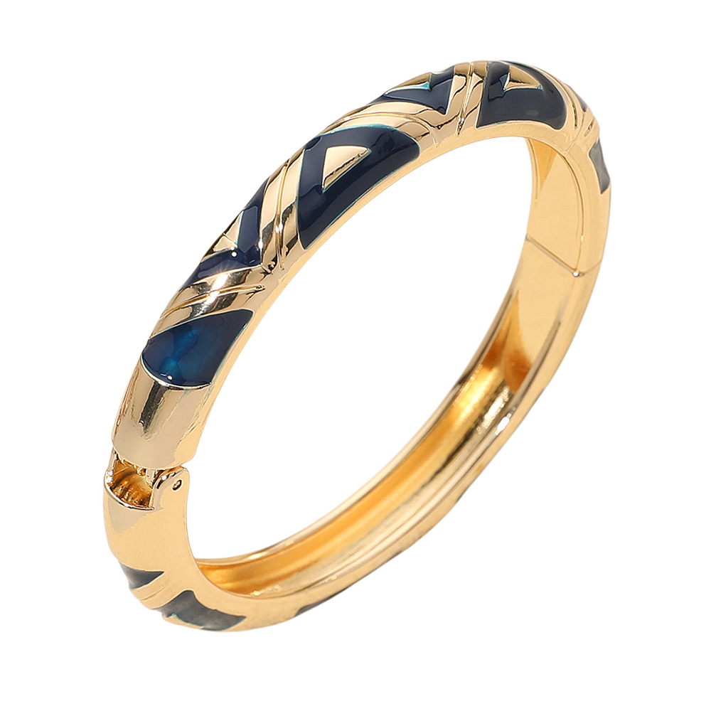 • Chic geometric hinged bangle bracelet featuring sleek enamel inlay and a polished metallic finish. Its modern pattern adds a stylish accent to any outfit, perfect for layering or wearing alone for an elegant statement. Ideal for both everyday wear and sophisticated occasions.